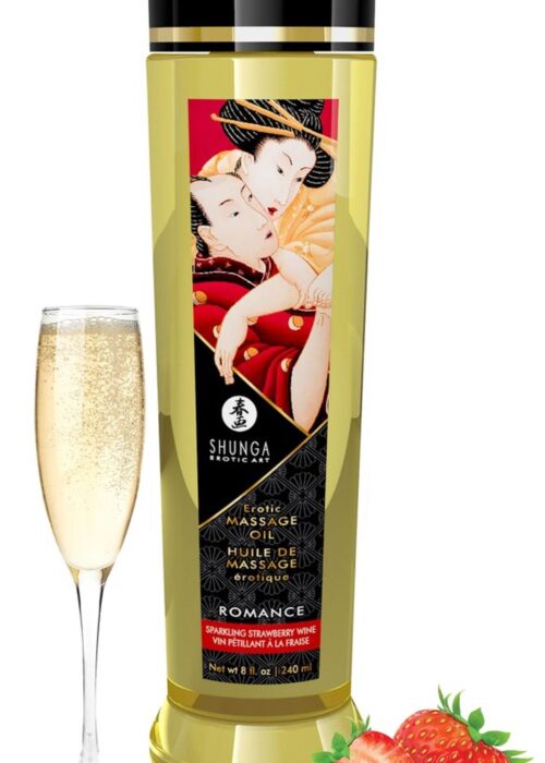 Luksusowy olejek do masażu erotycznego Romance od Shunga o zmysłowym zapachu truskawki/szampana, który pobudza zmysły podczas masażu solo lub partnerskiego i sprawia, że chcesz więcej! Wegański olejek do masażu wykonany jest w 100% z naturalnych olejów tłoczonych na zimno i zawiera pielęgnującą skórę witaminę E. Delikatnie i łatwo sunie po skórze, nie pozostawiając nieprzyjemnego tłustego uczucia ani pozostałości. Wręcz przeciwnie, pozostawia skórę jedwabiście miękką! Ponadto jest bardzo bogaty dla wielu zmysłowych i namiętnych masaży całego ciała.