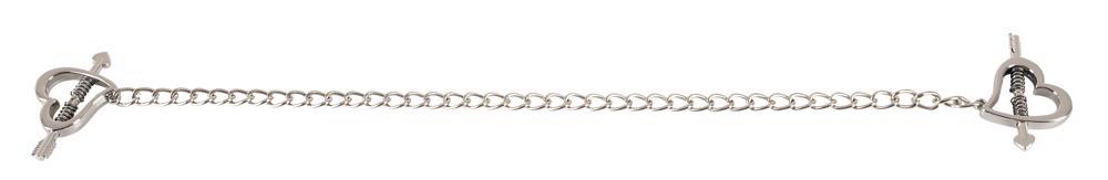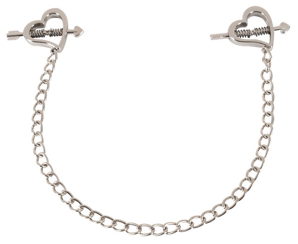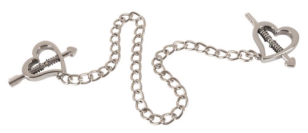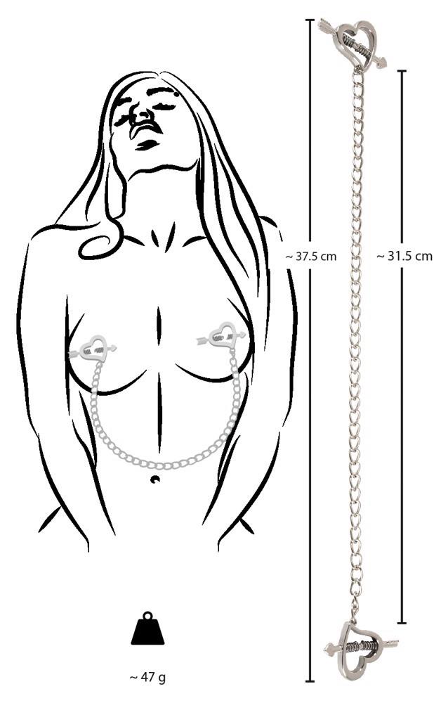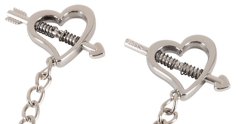 Te zaciski na sutki w kształcie serca od Bad Kitty mocno trzymają sutki i ozdabiają klatkę piersiową fajnym łańcuszkiem ze stali nierdzewnej. Zaciski, również wykonane ze stali nierdzewnej, składają się z eleganckiego serca, w którym dwa sprężynujące bolce stykają się pośrodku w kształcie strzały. Wystarczy rozsunąć trzpienie, umieścić smoczek w środku szczeliny i zwolnić oba trzpienie. Szlachetne zaciski przytrzymują sutki z ekscytującym naciskiem.