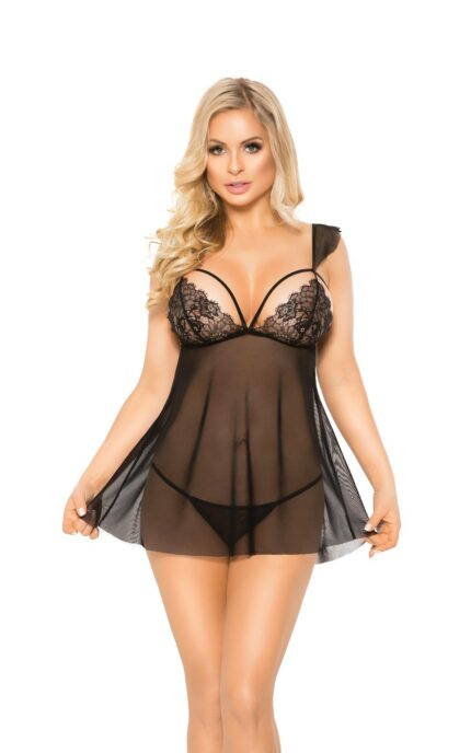 A tempting sheer design and alluring lace for the cups. Appealing halter chemise set from René Rofé. Includes a matching G-string. Hand wash.Be the belle of the night with the Dolled Up Halter 2 Piece Chemise Set. This combination of sleek and sultry is the best way to spend a comfortable and cozy night in while giving your partner ideas for more.Accent the curves of your body with a floral lace bust and sheer draped chemise with side splits to give a tease of skin. Take your night to the next level and get all dolled up without anywhere to go.Flowery lace patterns add a pretty twistSee-through mesh material makes up part of the top and all of the chemiseHalter style top for comfortMaterial: 90% Nylon and 10% Spandex for a comfortable fitClick here for the René Rofé Size Chart Fabric care Hand wash in cold water Do not dry clean Do not bleach Line dry Do not Iron