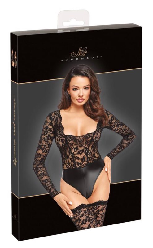 Cosy long-sleeved bodysuit from Noir with a top made of soft, stretchy lace and briefs in an elegant power-wet look. Extra low-cut, with a practical zip at the crotch.