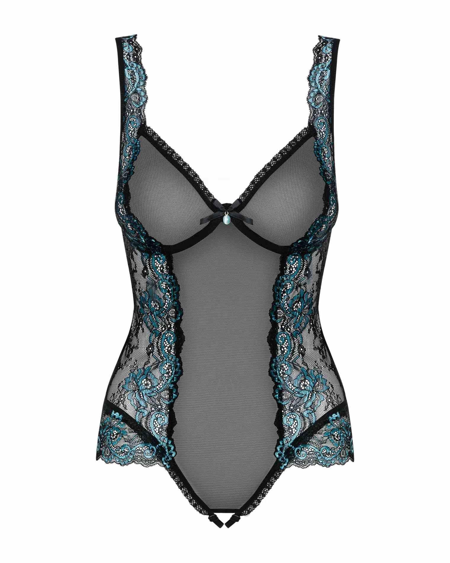 – prześwitująca siateczka połączona z koronką ozdobioną błyszczącą, turkusową nitką