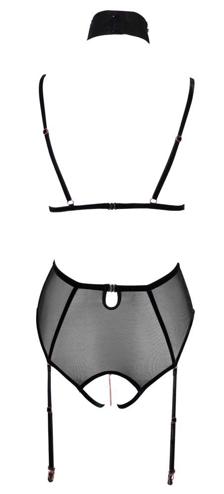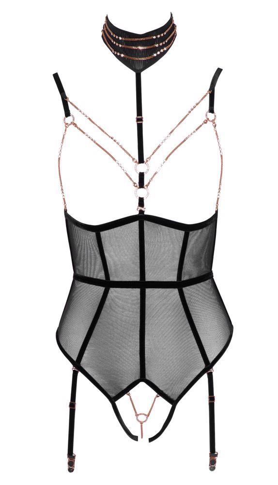 Body bez biustu Abierta Fina z całkowicie otwartym kroczem wykonane z powernetu z elastycznymi aksamitnymi paskami i biżuteryjnymi elementami w kolorze różowego złota. Ramiączka i szelki regulowane, szelki również odpinane. Regulowane ramiączko dekoltu z naszyjnikiem ozdobionym łańcuszkiem (z zapięciem na guzik) jest również odpinane, podobnie jak łańcuszki na piersi z małymi karabińczykami oraz łańcuszek w kroku z ozdobnym kółkiem. Wszystkie łańcuszki są dodatkowo ozdobione małymi dżetami. Widok z tyłu w dwuczęściowej stylizacji z dwoma zapięciami na biustonosz i majtki/taśmę w pasie.