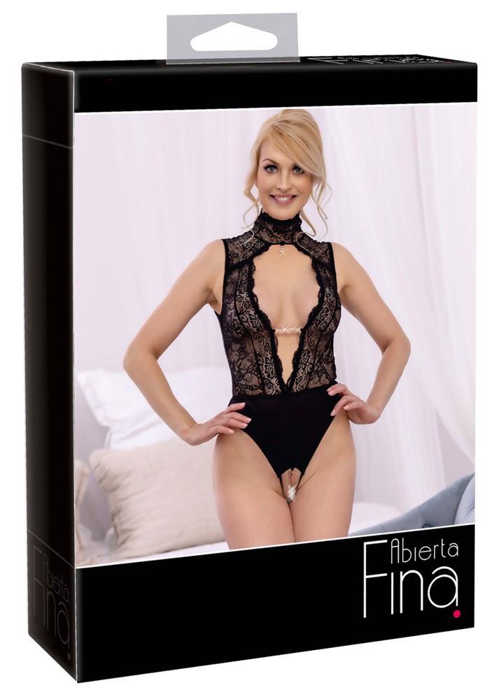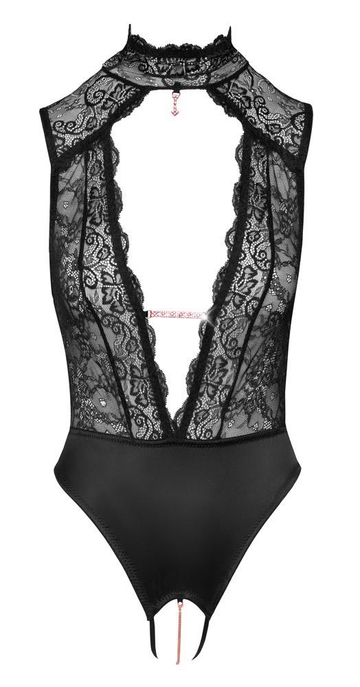 Rewelacyjne dwuczęściowe body Abierta Fina wykonane z delikatnej koronki i szlachetnej elastycznej satyny. Mimo wysokiego, dobrze wyprofilowanego kołnierza zapinanego na guziki, duże wycięcie z przodu i z tyłu jest niezwykle prowokujące. Mała zawieszka z dżetów na kołnierzu i mieniący się łańcuszek z dżetów z przodu to dodatkowe elementy przyciągające wzrok. Bardzo kuszące jest również całkowicie otwarte krocze, z pobudzającym łańcuszkiem, który można również odpiąć.