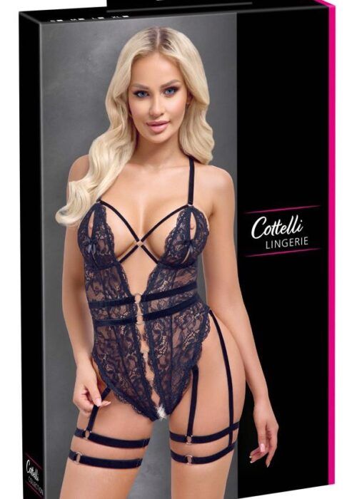 Czarne body bez krocza marki Cottelli LINGERIE z paskami do pończoch i szelkami na udach (wszystkie odpinane). Body wykonane z miękkiej czarnej elastycznej koronki w kwiaty. Całkowicie otwarte z przodu, ozdobne srebrne pierścienie mocno trzymają wszystko razem. Również uwodzicielsko otwarte w kroku. Koronkowe miseczki z małymi haczykami do otwierania i stylowymi ramiączkami i pierścieniem. Regulowane elastyczne aksamitne paski w talii. Ramiączka i paski na udach są również wykonane z elastycznych aksamitnych pasków i można je dopasować. Biżuterię na udach można również całkowicie zdjąć wraz z paskami do pończoch.