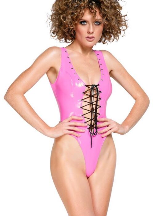 The short, vinyl body from Black Level is bright pink. It is low cut at the front and the back. There is also black lacing at the front and the back, which is threaded through silver-coloured metal eyelets. The long lacing can be tightened and therefore adjusted to fit. The very high-leg design puts the thighs and buttocks in the limelight in an extremely sexy way.
