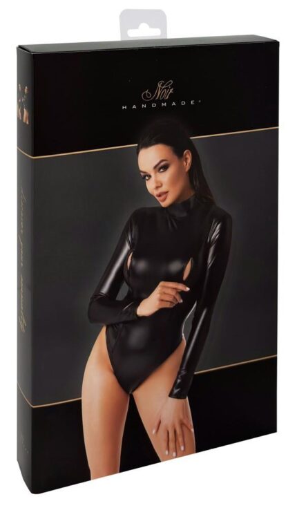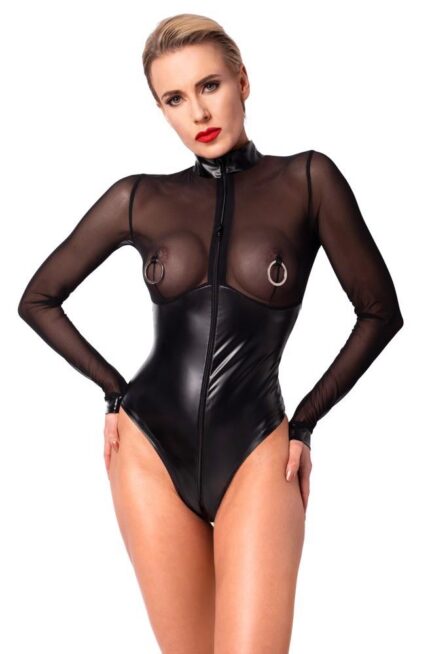 The high-neck body from Noir has long sleeves and it is made out of trendy, black powerwetlook. It is also soft and stretchy for a very comfortable fit. It has an emphasising cut with long, carefully-integrated zips over the breasts. The very high-leg design puts the legs and buttocks in the limelight.
