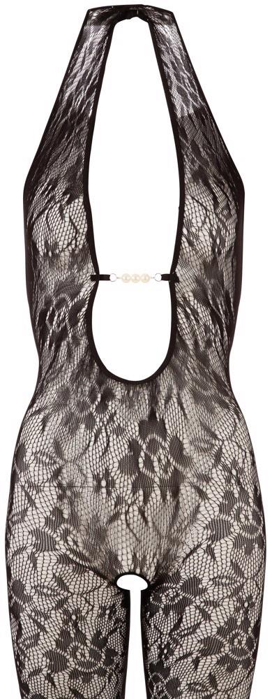 Erotyczny klejnot! czarny kombinezon wykonany z filigranowej siatki, z uchwytem na szyję i trzema perłami na dekolcie. W kroczu otwartym. Ze stopą. 100% poliamid.