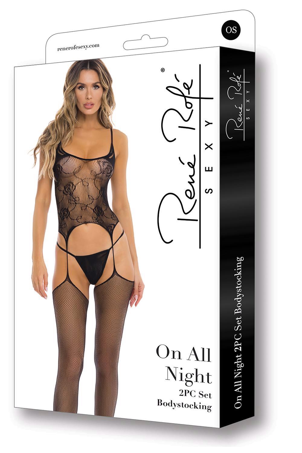 Our All Night Long 2-piece set bodystocking will have you yearning for more. Featuring alluringly beautiful gossamer lace and supple netting with an ultra seductive written message on the back of the stocking. A go-to piece for satiating any of your sexual desires.Click here for the René Rofé Size Chart Fabric care Hand wash in cold water Do not dry clean Do not bleach Line dry Do not iron