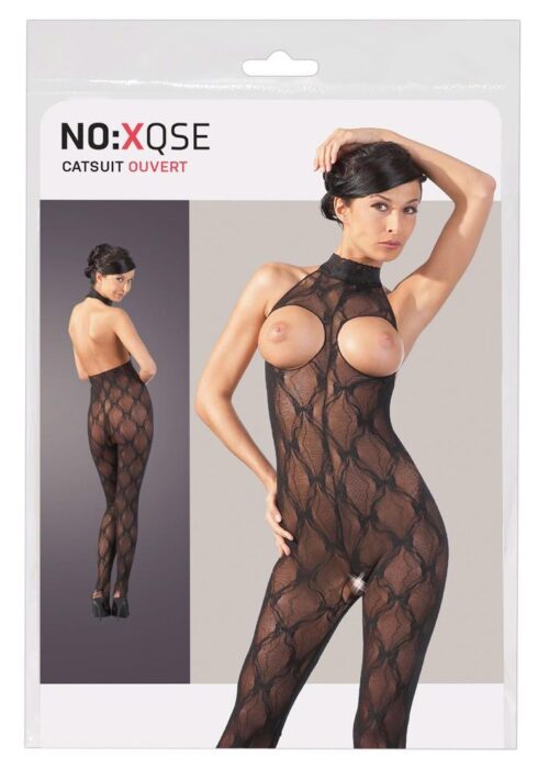 Kombinezon bezopiersiowy wykonany z koronki z efektem przytulania z halterem na szyi, który można otworzyć za pomocą rzepu. Bez tyłka i kusząco otwarty na krocze. Ze stopą. Czarny. 100% poliamid.