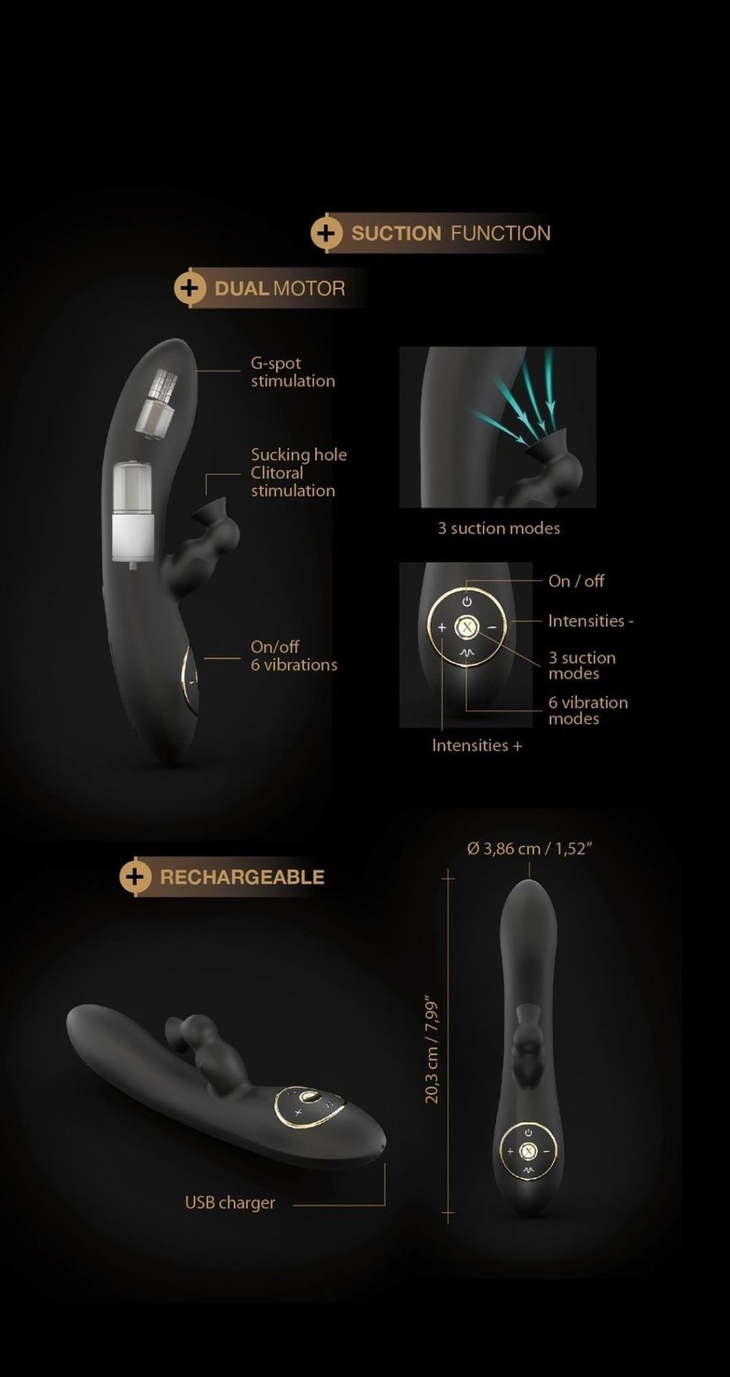Piękna i skuteczna stymulacja punktu G oraz łechtaczki. Niesamowity wibrator od Dorcel wykonany z miękkiego w dotyku czarnego matowego silikonu ze złotym wykończeniem. Pozwól sobie na orgazmiczną elegancję! Ta zabawka erotyczna z pewnością dopieści wszystkie kluczowe miejsca Twoich stref intymnych. Zakrzywiona końcówka pozwoli precyzyjnie stymulować punkt G, a wystająca część wyposażona została w dziurę zasysającą, która symuluje pieszczoty oralne. Wibrator wyposażony jest w dwa oddzielne silniczki, abyś mogła sama decydować o swoich doznaniach. Manipuluj rozkoszą, dzięki 3 trybom ssania oraz 6 trybom wibracji z możliwością regulowania intensywności!