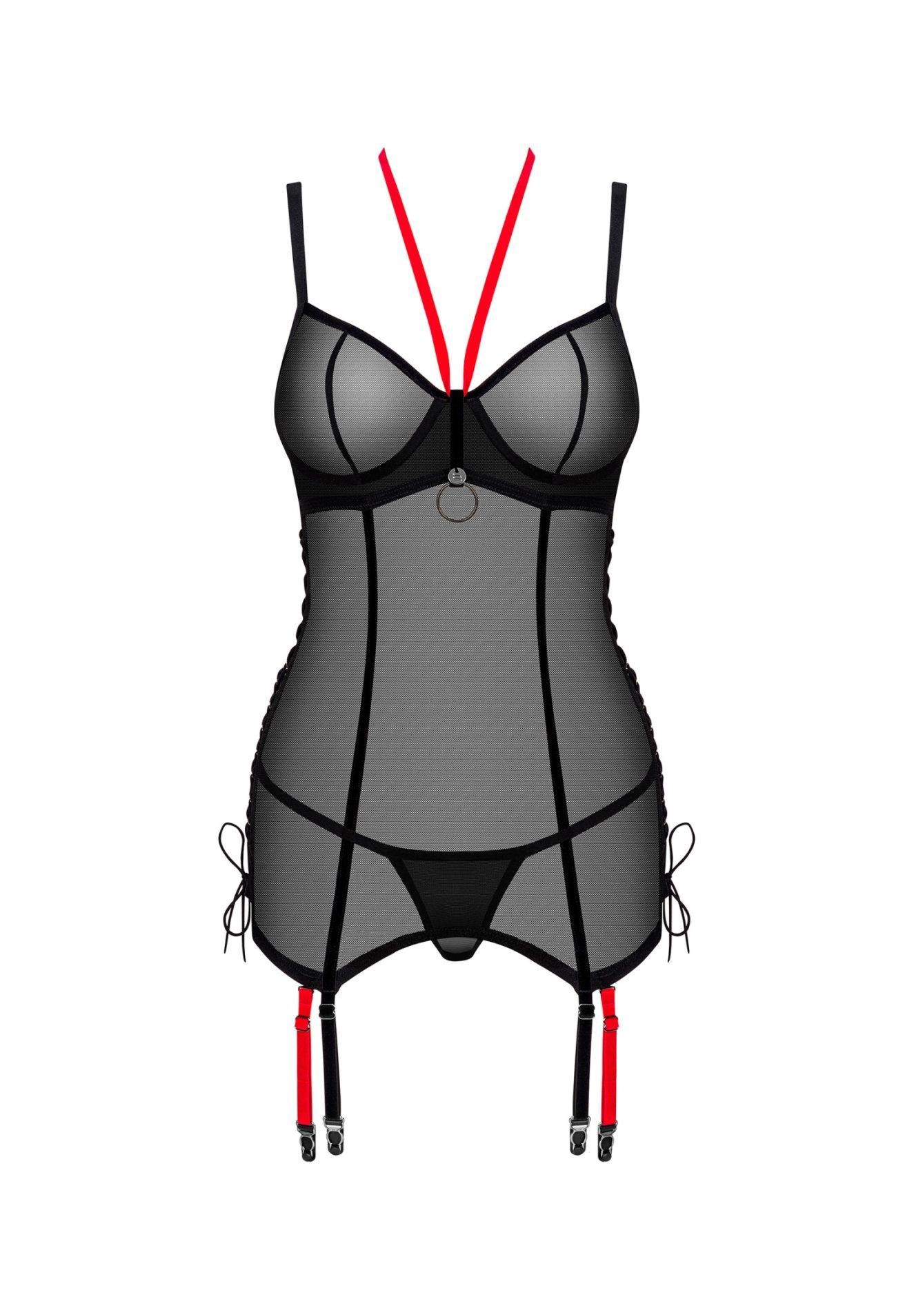 Zrób oszałamiające wrażenie w gorsecie i stringach Glandez. Delikatny, prześwitujący materiał w czarnym kolorze zestawiono z intensywnie czerwonymi akcentami, które z pewnością nie pozwolą oderwać od Ciebie wzroku! Zasmakuj upojnych chwil i pozwól sobie na nowe doznania.