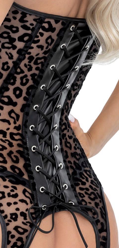 Haleczka bez ramiączek marki Noir z delikatnej przezroczystości z nadrukiem z aksamitu leo. Przednia wstawka i detale w szlachetnym matowym połyskującym power wetlook. Miękka, dookoła elastyczna mieszanka materiałów zapewnia wysoki poziom komfortu. Gorsetowy fason z ozdobnym sznurowaniem z tyłu i zapięciem na haftki z przodu umiejętnie podkreśla sylwetkę. 6 szerokich szelek doskonale dopełnia uwodzicielski styl.