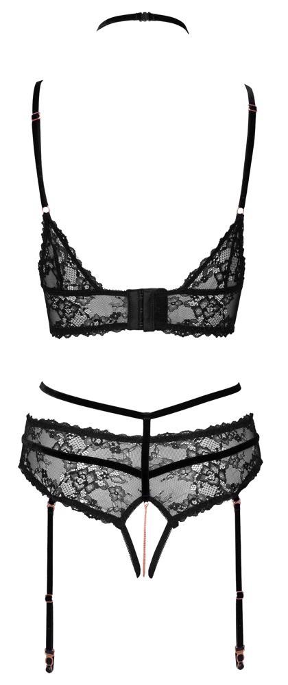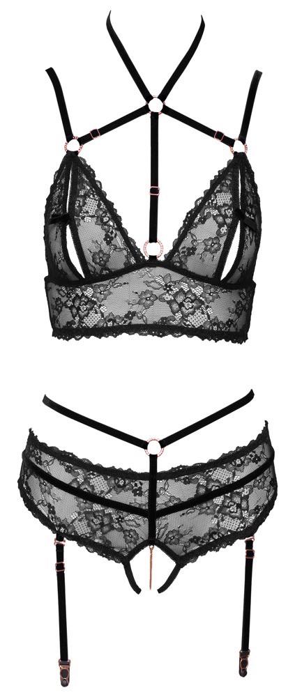 Ouvert bralette i majtki z podwiązką w komplecie marki Abierta Fina. Delikatna koronka i miękki aksamit w ekscytującej stylizacji z metalowymi elementami w kolorze różowego złota i błyszczącymi pierścieniami dżetów. Braletka z rozciętymi miseczkami, aksamitnymi wstążkami przy dekolcie i zapięciem na haftki z tyłu. Majtki z otwartym kroczem, przez które przebiega stymulujący łańcuszek, który można również odpiąć. Elastyczne, aksamitne ramiączka, szelki i opaska na dekolt są regulowane dla idealnego dopasowania – szelki są również całkowicie odpinane.