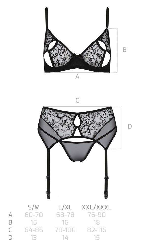 Biustonosz na fiszbinach, pas do pończoch i stringi w komplecie Primula z kolekcji Eco marki Passion. Wszystkie trzy części są wykonane z przezroczystego elastycznego powernetu. Pasek do pończoch z przodu z delikatną, wypalaną koronką i dwoma wycięciami, tak jak miseczki biustonosza z fiszbinami. Obie części bielizny zapinane z tyłu na haftki, paski do pończoch i ramiączka biustonosza można regulować.