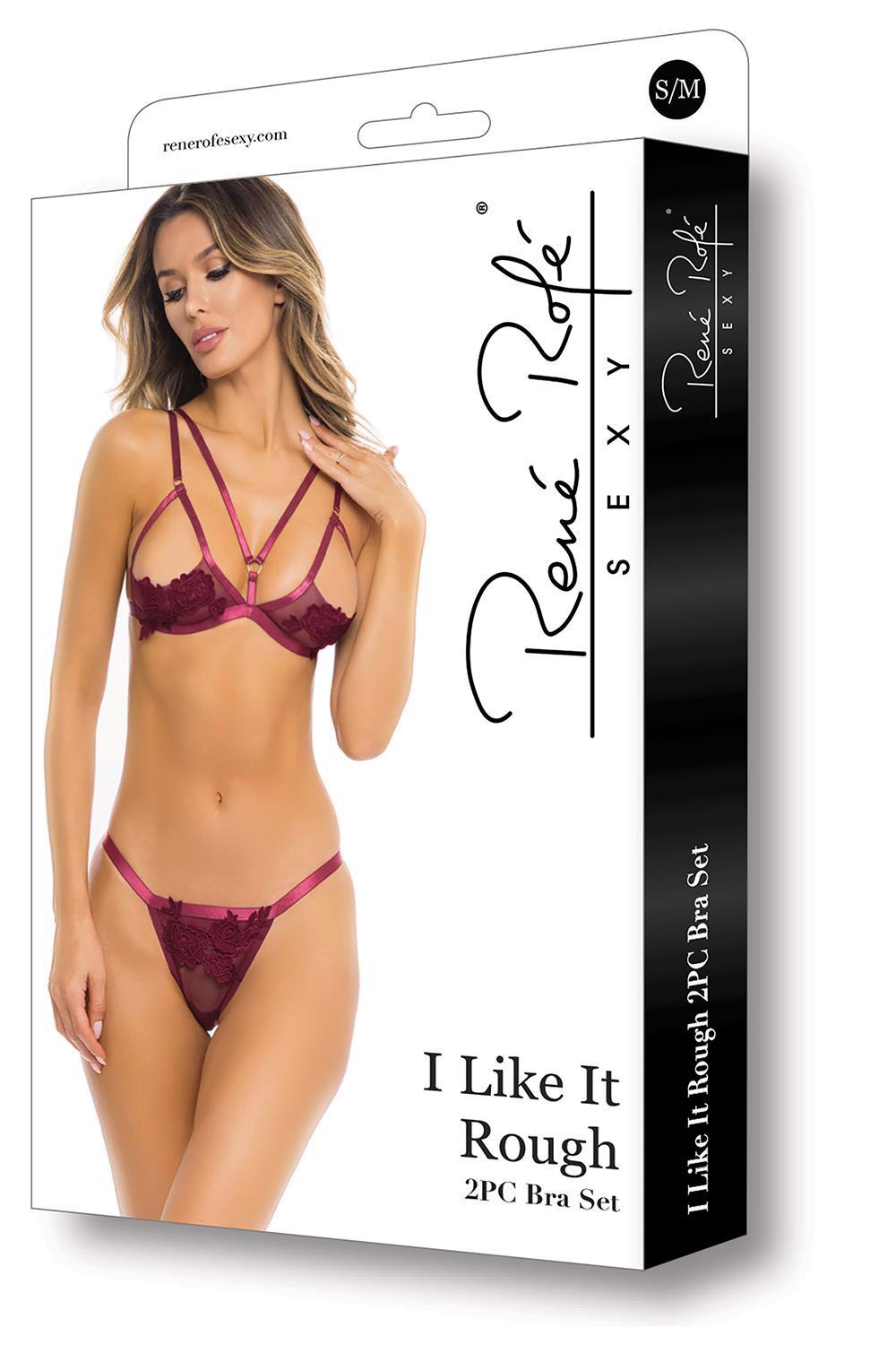 I Like It Rough 2-piece bra set. Release your inner most desires with our I Like It Rough 2-piece bra set. The sexy floral applique details, contrasted with the beautifully constructed straps keeps you going all night long.Click here for the René Rofé Size Chart Fabric care Hand wash in cold water Do not dry clean Do not bleach Line dry Do not iron