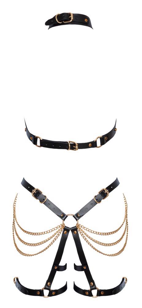 2-piece harness set from ZADO with a halterneck top and thong with thigh straps. Both pieces are made from black leather straps with opulent gold chains and decorative studs, rings and buckles. Adjustable for a perfect fit.