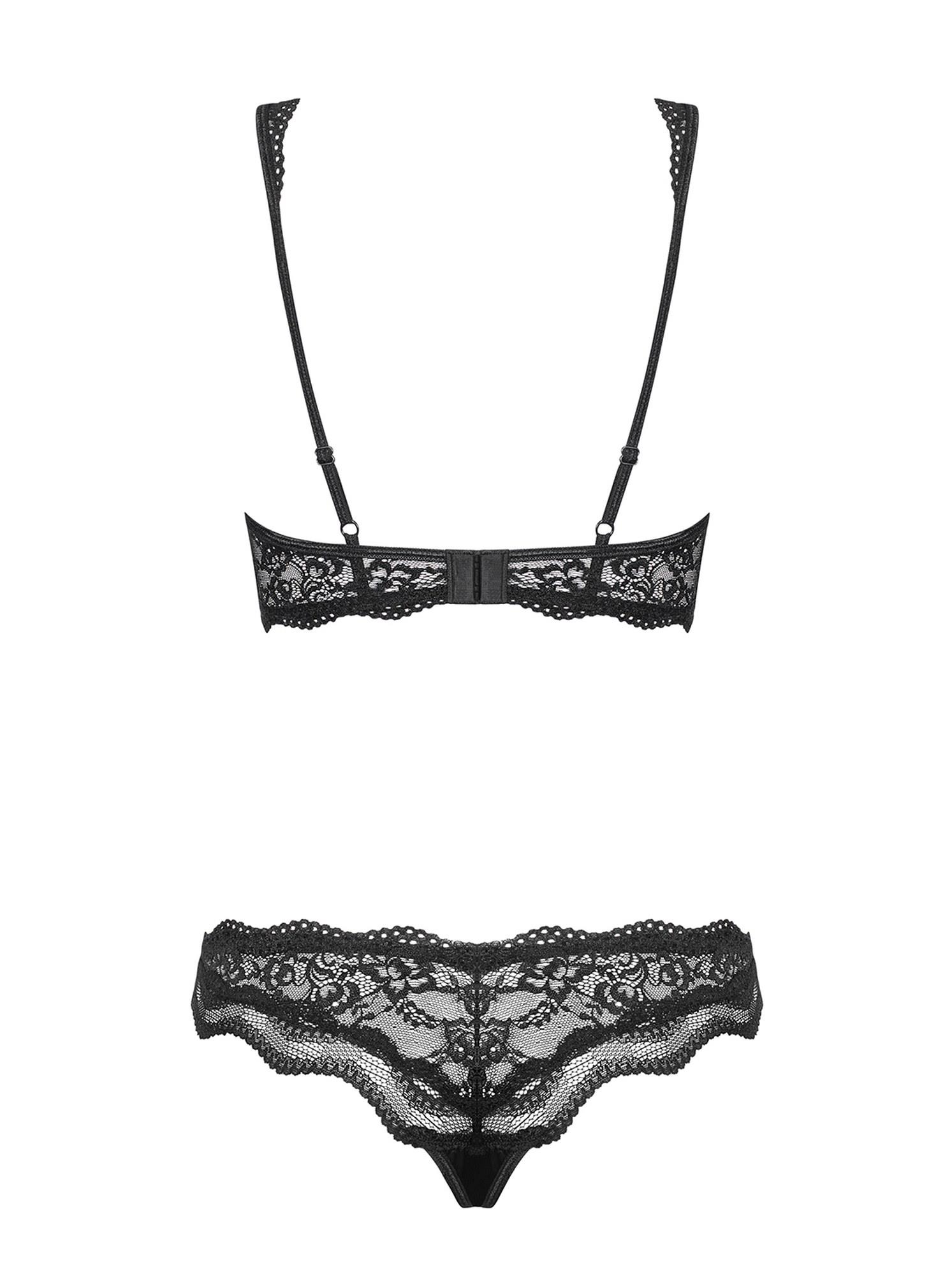 Seksownie skrojony biustonosz i figi w kolorze intensywnej czerni, tworzą wyjątkowy komplet Luvae. Mała perełka na środku biustonosza dodaje szyku, a zastosowane w miseczkach fiszbiny, dadzą komfort i wspaniałe samopoczucie w czasie noszenia.