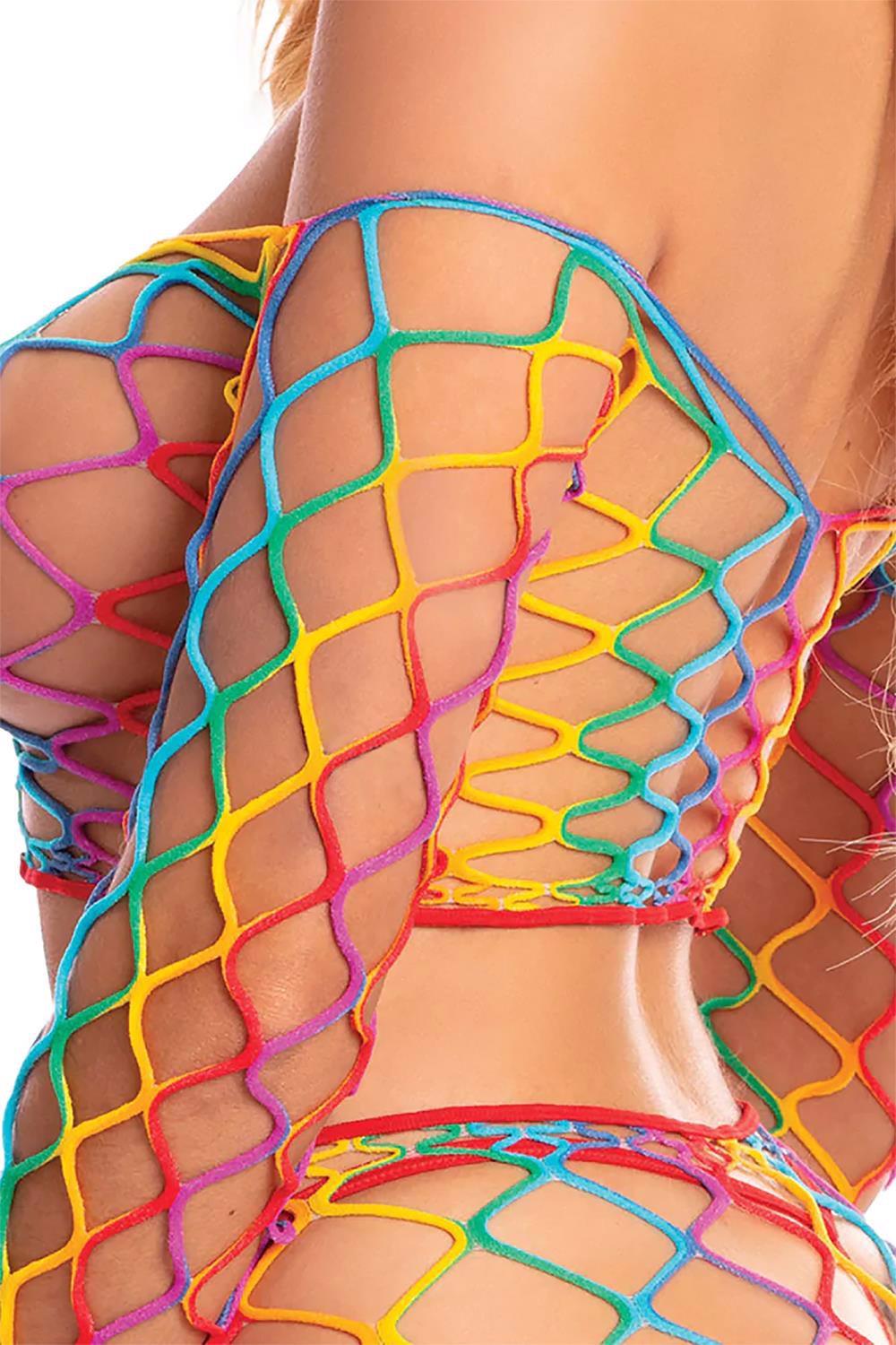 Pot of Gold is a 2pc set made of fishnet fabric in bright rainbow colours with large openings. It features a crop top with long sleeves and a skirt. A sensual display of your true colors. The Pot of Gold 2-Piece Skirt Set features a crop top and a skirt. Made of a fishnet material with large gaps, you’ll be able to flaunt plenty of skin while also flashing plenty of pretty colors.This set is super versatile as you can wear it on its own and give your partner a visual treat, or tease them by pairing it with a bra and panties of your choice. Whichever path you choose, your partner will certainly feel as if they’ve struck gold!Comfortable fishnet materialCrop top and skirt comboBright rainbow color schemeClick here for the Pink Lipstick Size Chart Fabric care Hand wash in cold water Do not dry clean Do not bleach Line dry Do not iron