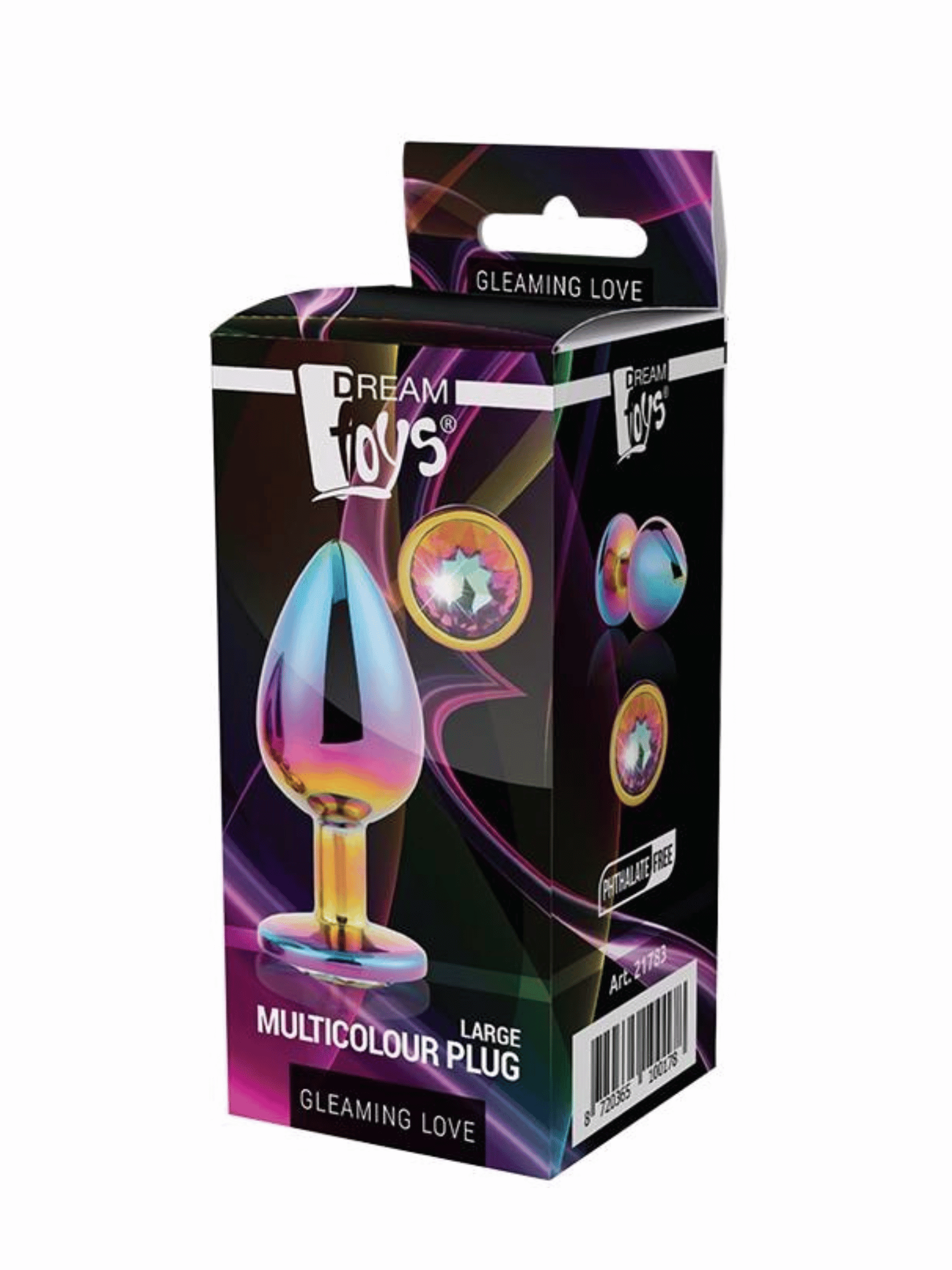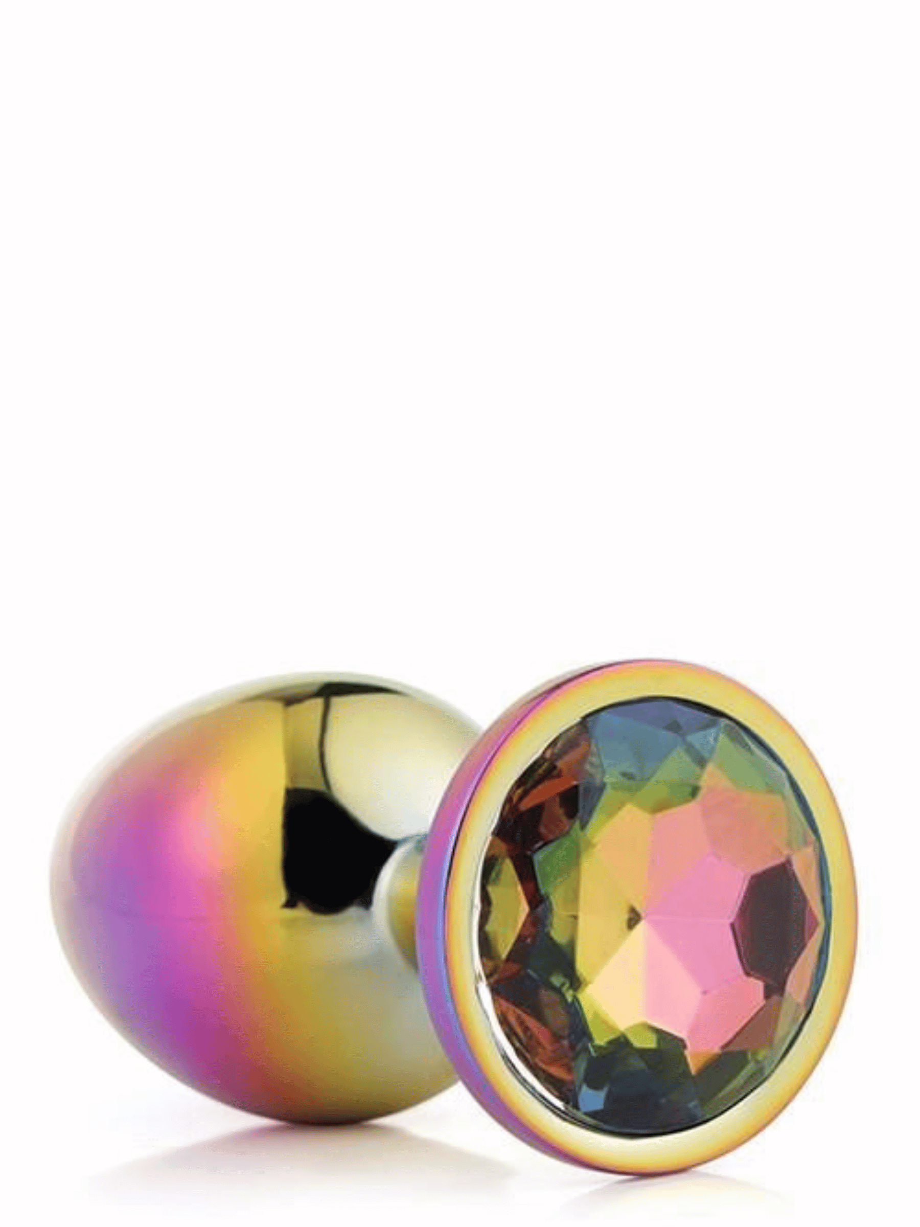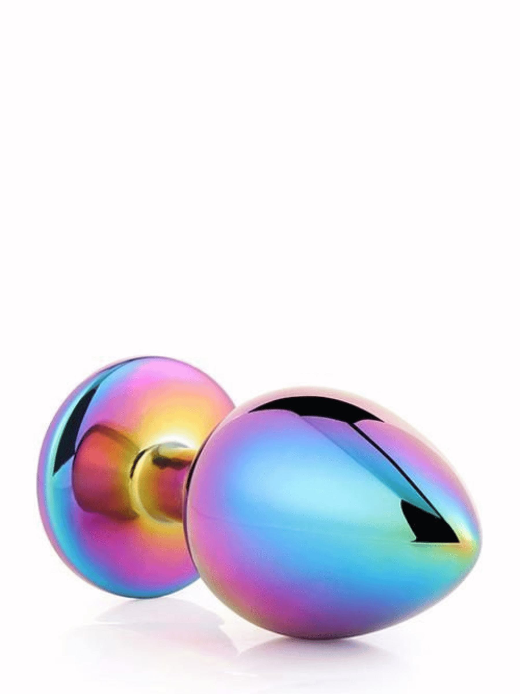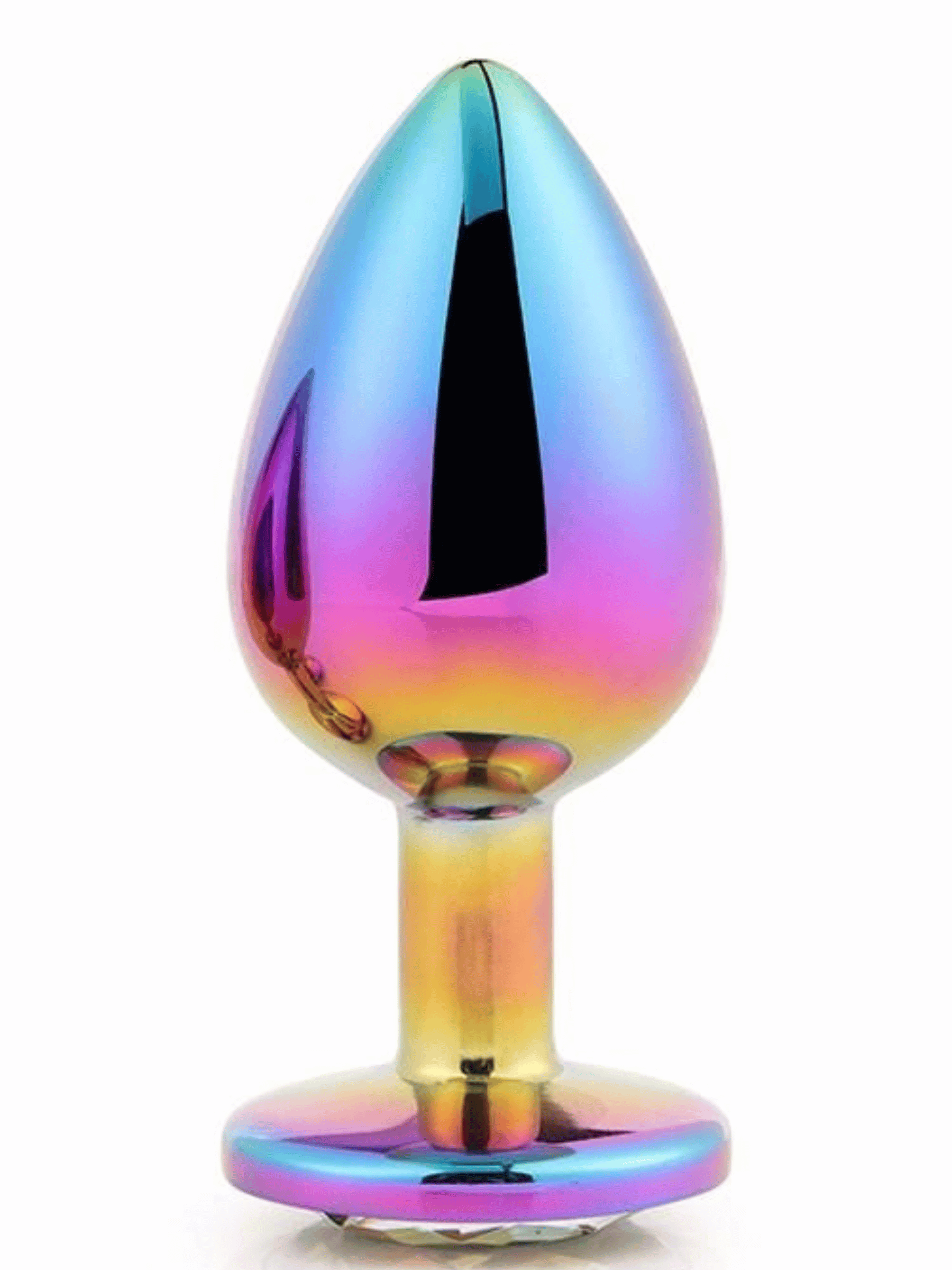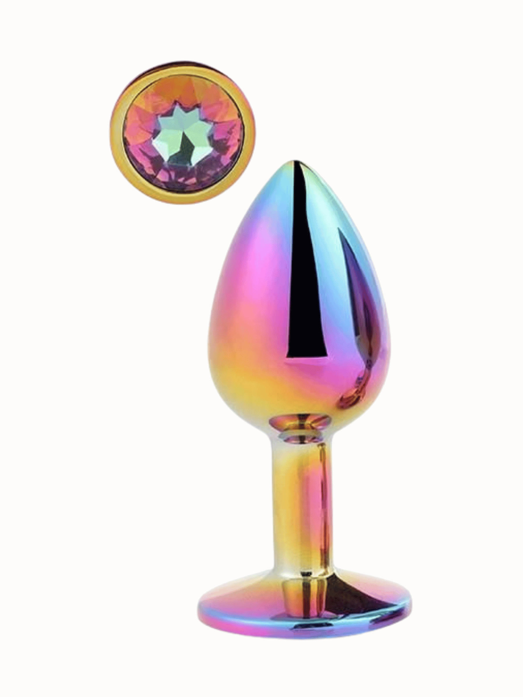 Korek analny z kategorii biżuterii analnej, wykonany z lekkiego aluminium o gładkiej, bezszwowej powierzchni z połyskliwym wykończeniem. Produkt ma zwężaną, stożkową formę oraz rozszerzaną podstawę, w której umieszczono dekoracyjny, okrągły kamień. Korpus korka posiada wielokolorowe wykończenie, a element ozdobny jest trwale zintegrowany z podstawą. W zestawie znajduje się woreczek do przechowywania wykonany z miękkiej, aksamitnej tkaniny ze sznurkiem.