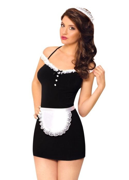 kostium pokojówki wykonany z elastycznej koronki i połyskujące tkaniny,