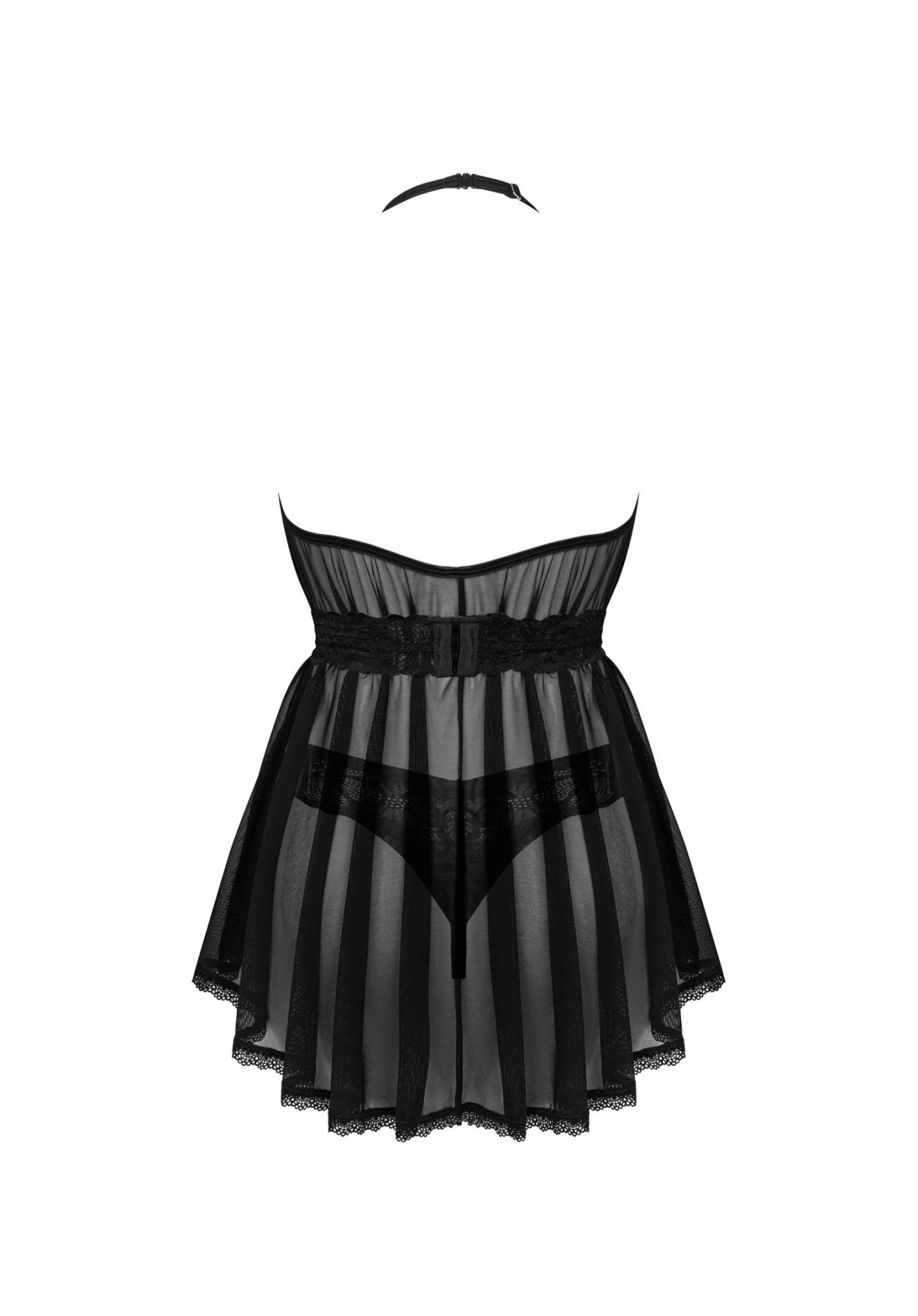 Zmysłowe doznania są na wyciągnięcie ręki! Wyjątkowa koszulka babydoll to połączenie szykownej elegancji z odrobiną kokieterii. Poczujesz się niezwykle atrakcyjnie, gdy czarna tkanina z lekkością przykryje biust, brzuch oraz pośladki, a stringi z intrygującym haftem wydłużą Twoje nogi! Przygotuj się na rozkoszne chwile!