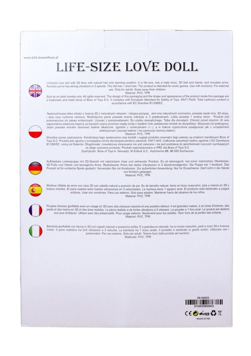 Nadmuchiwana lalka miłości z twarzą 3D z naturalnymi włosami i stojącą pozycją. Jest ona naturalnych rozmiarów, posiada męski tors, 3D stopy i ręce oraz ruchome ramiona. Realistyczny penis posiada mocne wibracje w trzech prędkościach. Lalka posiada 1 otwór analny.