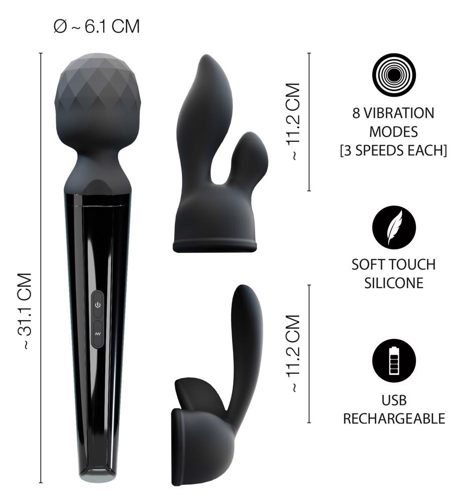 Ekskluzywny, ładowalny wibrator ścienny z 2 nasadkami od 40 lat. 8 trybów wibracji w 3 prędkościach zapewnia indywidualną przyjemność masażu i może być wygodnie sterowany za pomocą przycisku na uchwycie. Ergonomiczna konstrukcja z bardzo długim uchwytem i ruchomą głowicą masującą z łatwością dociera do wszystkich części ciała i zewnętrznych punktów rozkoszy, by rozpieszczać je wibracjami i masażem. Dwie nasadki są łatwo dołączane i wymienne, pieszcząc waginalnie lub analnie z jednoczesną stymulacją łechtaczki lub krocza. Głowica masująca z aksamitną, miękką w dotyku fakturą zapewnia bardzo przyjemne uczucie na skórze. Kabel USB do ładowania w zestawie.