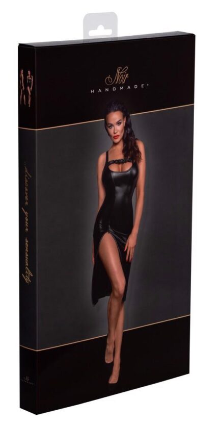 Knee-length dress from Noir. Tight-fitting cut in an elegant, supple powerwetlook. Soft and stretchy all over for maximum comfort. Low-cut at the front and back, with a decorative ruffled band at the neckline. An exciting zip at the side of the front that can be opened up to the thigh. There is also a walking slit at the back.