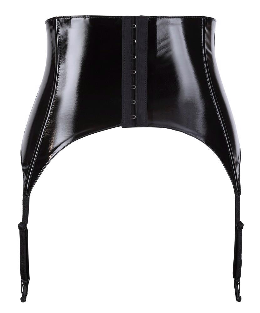 Bardzo szeroki pas do pończoch marki Black Level w całości wykonany z czarnego, patentowego połysku z 5 ozdobnymi metalowymi klamrami z przodu. Wbudowane paski kształtujące i dwukierunkowe regulowane zapięcie na haftki z tyłu zapewniają idealne dopasowanie. 4 szelki mają regulowaną długość.