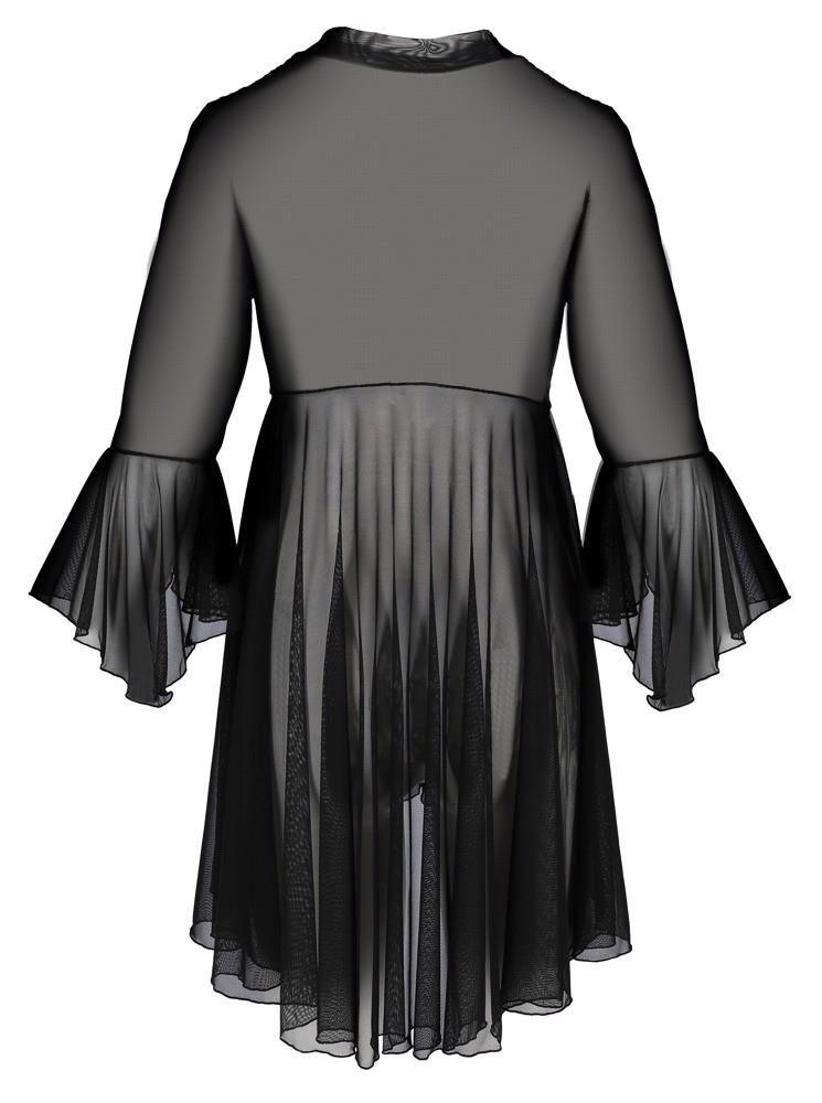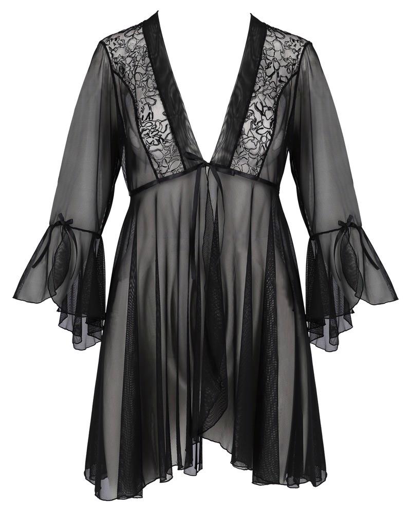 Miękko drapowane, krótko skrojone kimono Primula Peignoir z kolekcji Eco marki Passion wykonane z przezroczystego, elastycznego powernetu. Całkowicie otwarty z przodu z małą wiązaną kokardką, z każdej strony u góry wstawki z delikatnej koronki burnout. Szeroko rozkloszowany dół i krój nieco dłuższy z tyłu niż z przodu. Dopasowane szerokie, półdługie rękawy w kształcie trąbki.