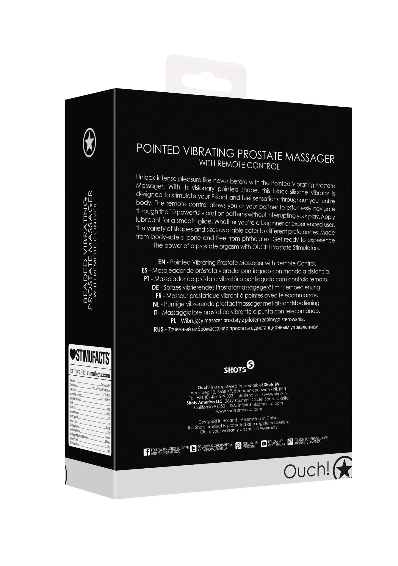 Odblokuj intensywną przyjemność jak nigdy dotąd dzięki spiczastemu wibrującemu masażerowi prostaty. Dzięki wizjonerskiemu, spiczastemu kształtowi, ten czarny silikonowy wibrator został zaprojektowany do stymulacji punktu P i odczuwania wrażeń na całym ciele. Pilot zdalnego sterowania pozwala Tobie lub Twojemu partnerowi bez wysiłku poruszać się po 10 potężnych wzorach wibracji bez przerywania zabawy. Nałóż lubrykant, aby uzyskać płynny poślizg. Niezależnie od tego, czy jesteś początkującym, czy doświadczonym użytkownikiem, różnorodność dostępnych kształtów i rozmiarów zaspokaja różne preferencje. Wykonany z bezpiecznego dla ciała silikonu i wolny od ftalanów. Przygotuj się na moc orgazmu prostaty z OUCH! Prostate Stimulators.