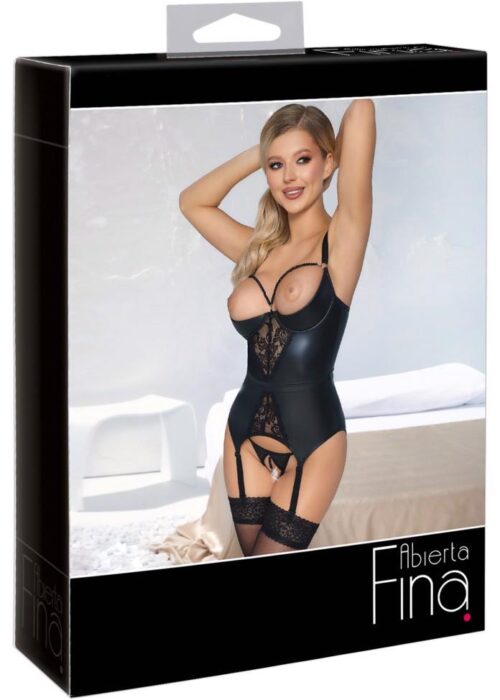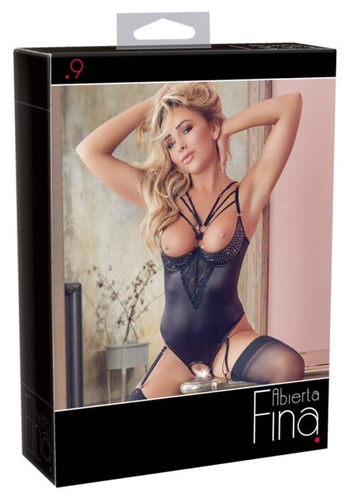 Zmysłowy korpus sznurkowy z regulowanymi, odpinanymi szelkami i lekko podszyty podnośnik z tyłu zapinany na haczyk. Z wyrafinowanymi detalami pasków i wyszukanym elementem dżetu na dekolcie. Półprzezroczysta koronkowa wkładka z przodu oferuje lazurowe spojrzenie. Na górze znajdują się dodatkowe wyszukane sznurowadła ze srebrnymi pierścieniami i elastycznymi gumkami. Krocze jest całkowicie otwarte. Podobnie jak w dekolcie, są tu ekscytujące detale pasków i kolejny element z dżetu.