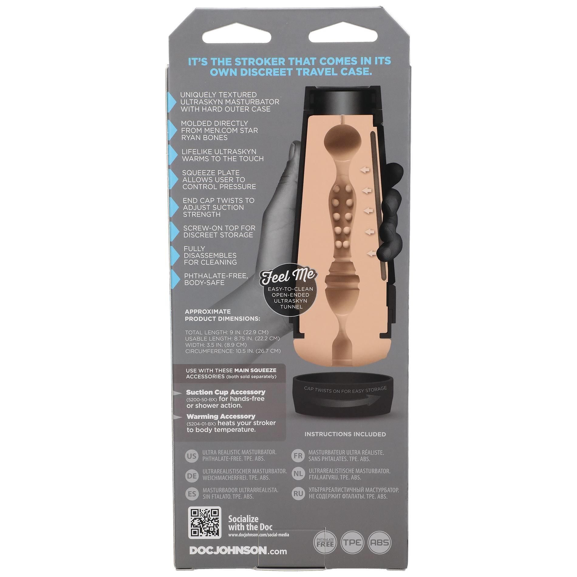 Model Ryan Bones wyposażony jest w regulowaną nakrętkę do kontroli siły ssania oraz ściśnięcie, które pozwala dostosować ciasność każdego ruchu. Ryan posiada realistyczne otwarcie przypominające męskie pośladki, które wyglądają i w dotyku przypominają prawdziwe ciało. Tak jak inne produkty z serii Main Squeeze, Ryan Bones jest wyposażony w unikalną teksturę wewnętrzną, która sprawia, że każde pchnięcie przypomina zanurzenie się w umięśnionym facecie z twoich marzeń.