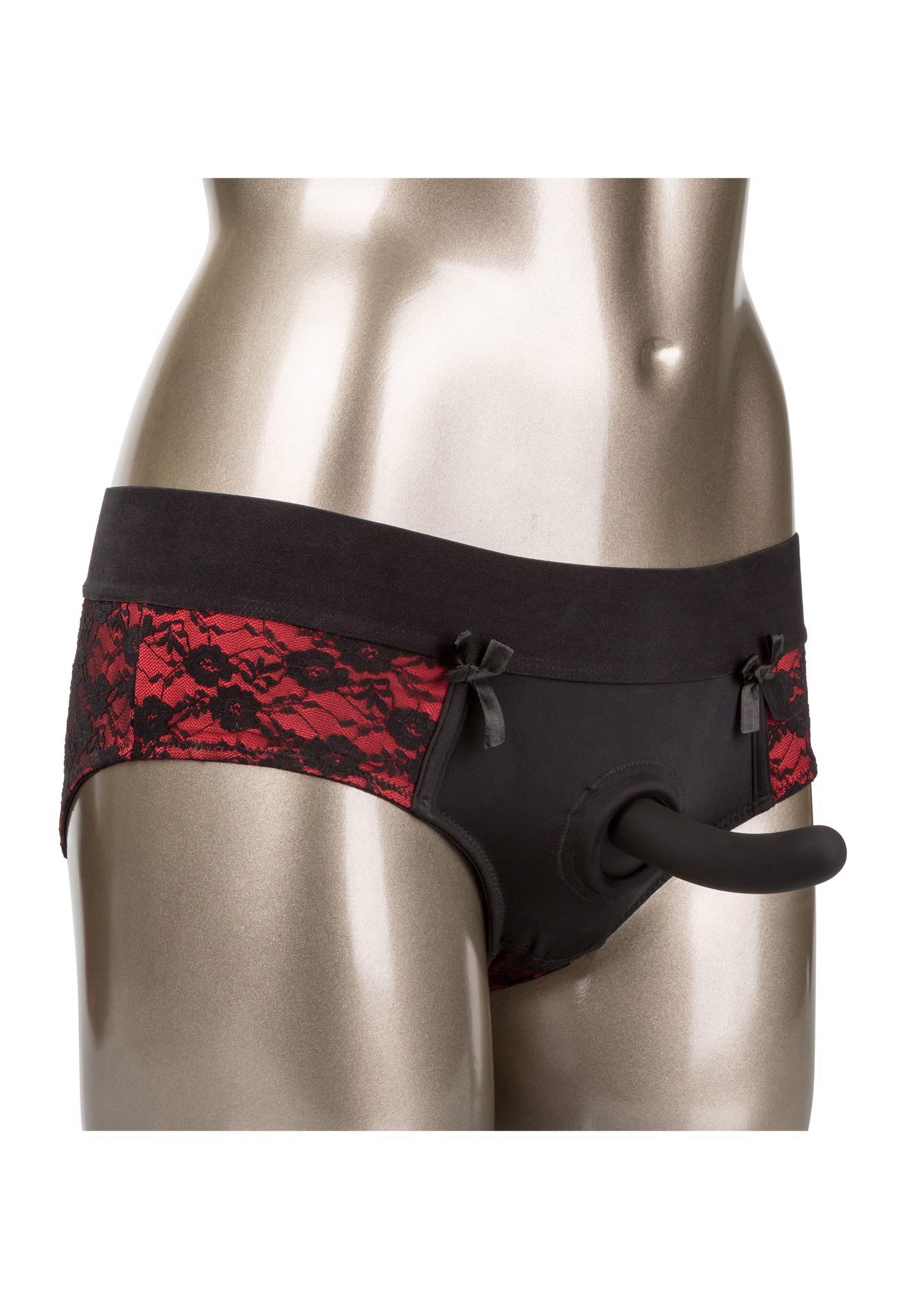 Indulge in the thrilling world of role reversal with the Scandal® Crotchless Pegging Panty Set with silicone probe. The designer pleasure panty set features a bold crotchless design, ergonomically curved probe and a supportive stretch to fit waistband. Never again fumble with uncomfortable straps or complicated harnesses by slipping into the simply comfortable crotchless pegging panty. While an extra wide waistband will move and flex with every thrust, the reinforced, stretchy O-ring holds the chosen probe in place even during the most vigorous pleasure play. Once playtime is over, the sinfully fun panties are 100% machine washable for your convenience. Surrender yourself to your most erotic fantasies and dive deep into pleasure as you slip into the fashion-forward fetish panty.The plush panty has a soft polyester lining, nylon lace exterior and fits a 26” (66 cm) waist and stretches up to an additional 8” (20.25 cm). The hypoallergenic Silicone probe measures 5” x 1.25” (12.75 cm x 3.25cm)