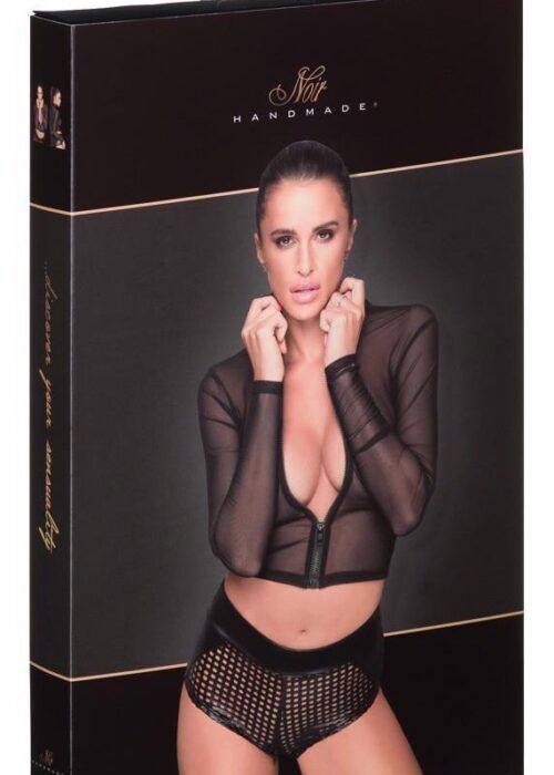 Short, tight long-sleeved top from Noir in a jacket style with a small stand-up collar and full-length zip at the front. The fine elastic powernet nestles particularly softly and gently against the skin. Subtle transparency with high wearing comfort that can be worn in a variety of outfits.