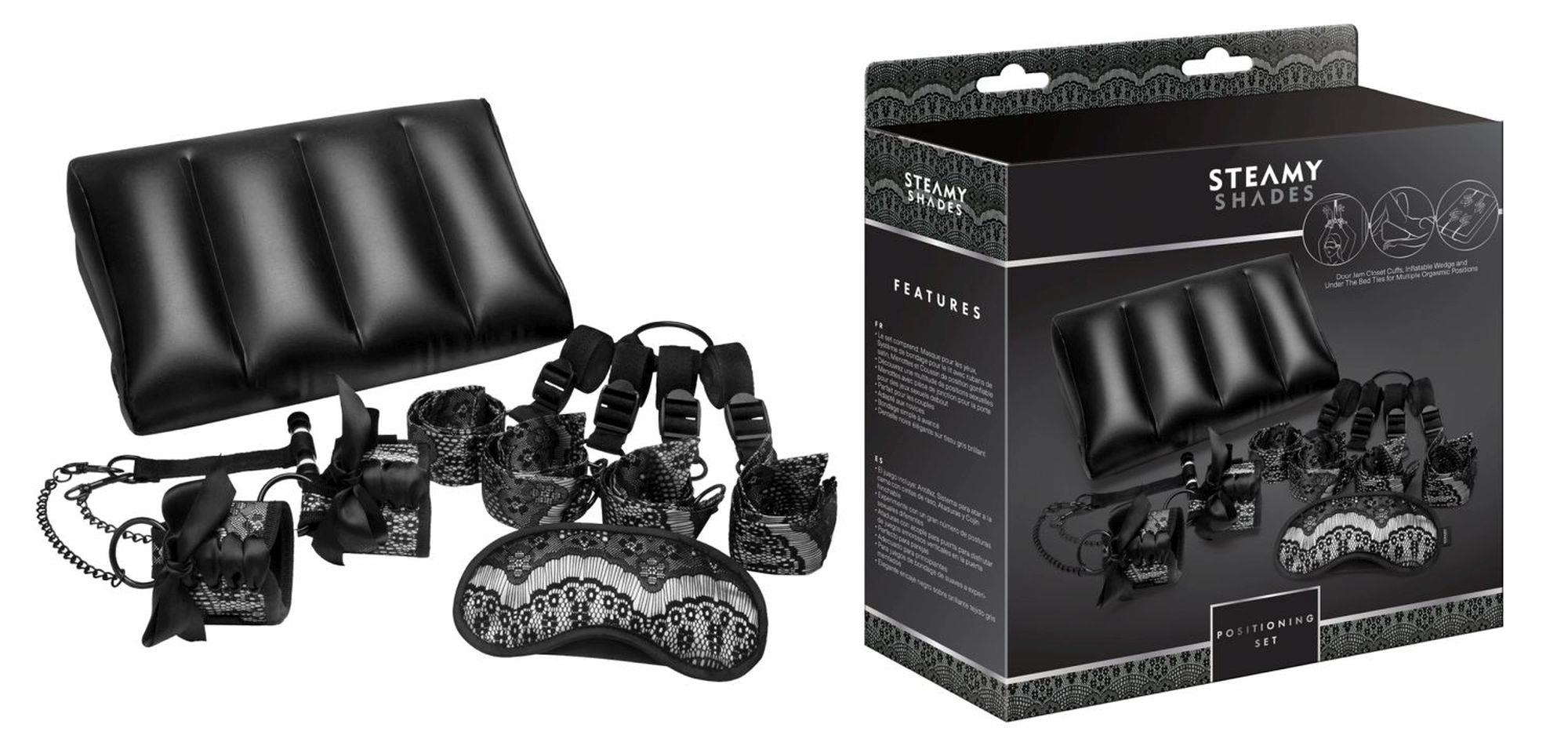 Zestaw zawiera: maskę na oczy, satynowe krawaty do łóżka, mankiety do zamykania drzwi i nadmuchiwany klin do pozycjonowania, oferuje różne opcje pozycjonowania, mankiety do zamykania drzwi pozwalają na intymną zabawę w pionie i są wyposażone w eleganckie sznurowane detale gorsetu, idealne dla par, początkujących przyjazna, lekka i średnia wiązanie, elegancka przezroczysta czarna koronkowa nakładka na szarą tkaninę. Maska na oczy: 100% poliester. Pod krawatami: krawaty (100% poliester) paski (100% polipropylen) Pierścienie i haki spustowe (100% żelazo bez niklu) Regulatory (100% plastik ABS). Mankiety do drzwi szafy: mankiety i wstążki (100% poliester) Pasek (100% polipropylen) Smycze, kółka, D-Ring i haczyki spustowe (100% żelazo bez niklu) Haczyk (100% akryl). Nadmuchiwany klin: 100% polichlorek winylu (PVC)