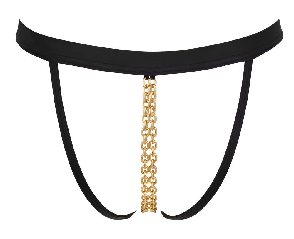 Stringi Bad Kitty wykonane z czarnych elastycznych taśm o modnym matowym wyglądzie z pobudzającym podwójnym łańcuszkiem w kroku w kolorze złota, który można odpiąć na kółku z przodu za pomocą dwóch małych karabińczyków.