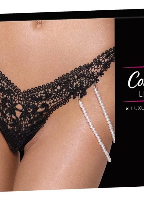 Stringi Rio marki Cottelli LINGERIE wykonane z cennej haftowanej koronki (przód) połączonej z elastycznym materiałem dopasowującym się do kształtu ciała. Po obu stronach elastyczny podwójny łańcuch z pereł, który można całkowicie odpiąć dzięki małym karabińczykom.