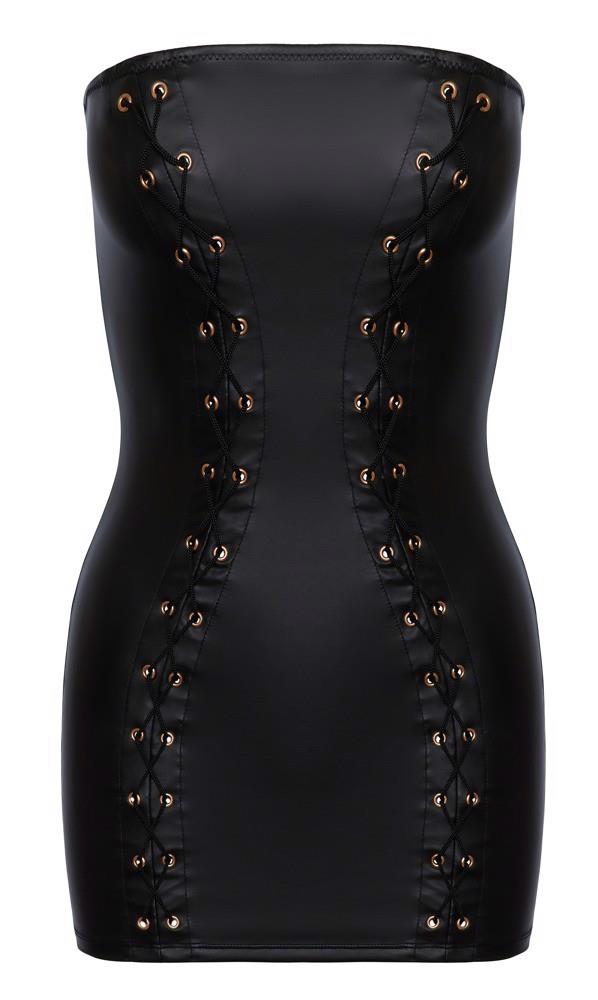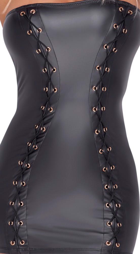This short, strapless tube dress has an elegant black matte look. With a narrow cut and fitted with rose gold-coloured metal eyelets for the 2 decorative laces at the front in a womanly hourglass look. Soft and highly stretchy for high comfort.