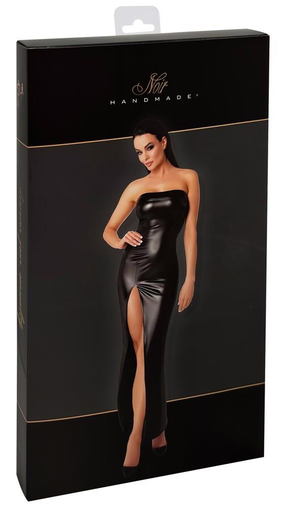The long, figure-flattering tube dress from Noir is made out of beautiful black powerwetlook. It is soft and stretchy for a skin-tight but very comfortable fit. It is strapless and is held in place by the wide and stretchy cleavage strap. With a large slit up the slide at the front. With a zip at the back.