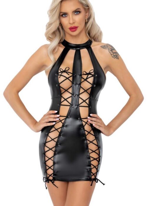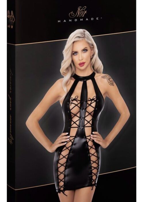 Highly stretchy, short dress from Noir in a classy, black powerwetlook. In a close-fitting cut with open lacing in the front that can be adjusted for a perfect fit. The back has a full-length 2-way zip that can be opened from the top and bottom.