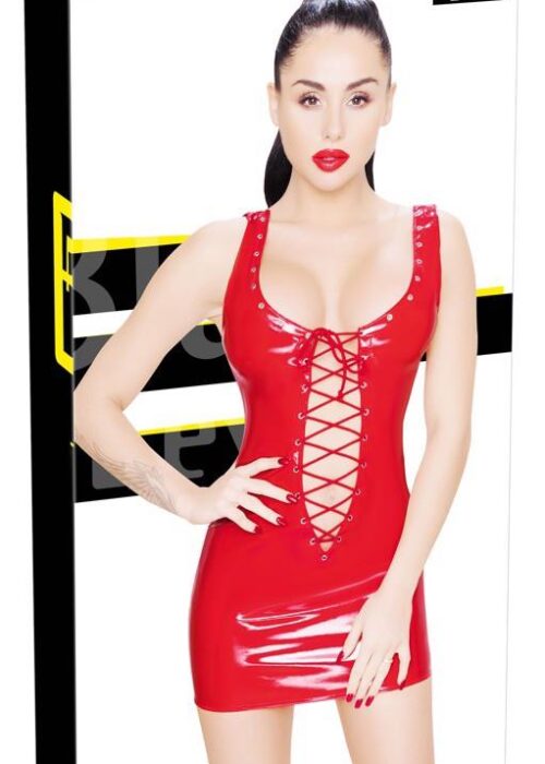 Krótka sukienka bez rękawów marki Black Level w kolorze ognistej czerwieni z patentowym połyskiem. Obcisły fason z zaszewkami na biuście zapewnia idealne dopasowanie. Bardzo niskie wycięcie z przodu i z tyłu oraz seksowne sznurowanie.