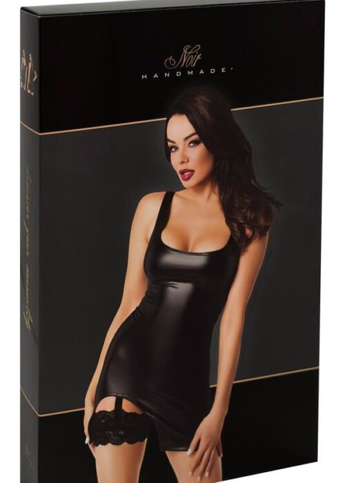The tight-fitting mini dress from Noir has straps and is made out of beautiful black powerwetlook. The suspender belt with a lace garter is securely sewn onto the curved part of the hem. Everything is soft and stretchy for a skin-tight but comfortable fit.