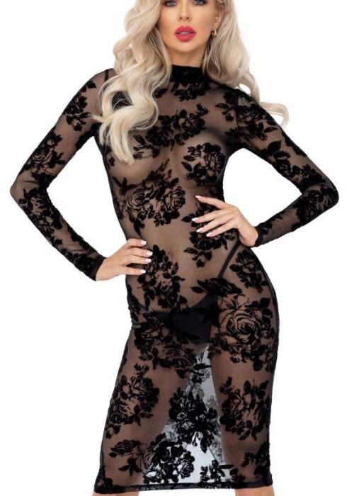 Sukienka z długim rękawem marki Noir całkowicie wykonana z delikatnego, elastycznego tiulu z aksamitnym nadrukiem w wyrafinowany kwiatowy wzór. Miękkie i elastyczne na całej powierzchni dla idealnego dopasowania z wysokim komfortem noszenia. W ekscytująco obcisłym fasonie i długości do kolan z chodzącym rozcięciem z tyłu. Stójka zamyka się na mały guzik przy szyi nad dużym owalnym dekoltem z tyłu.