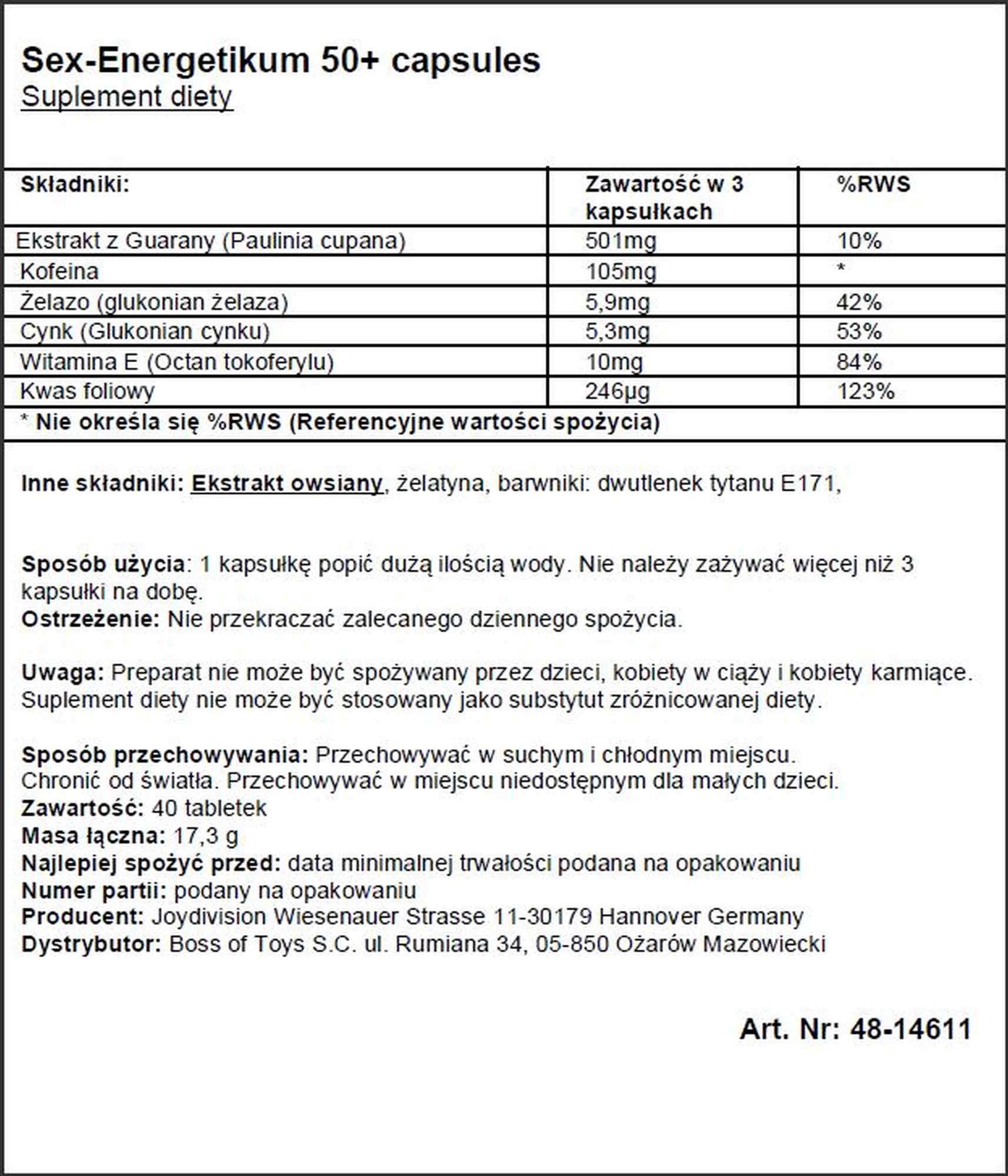 Połączenie witaminy i minerałów, zwiększy twoją seksualność! Specjalnie dla Panów po pięćdziesiątym roku życia pomagający odzyskać młodzieńczy wigor. Seks-Energetikum Pokolenie 50 + zwiększa seksualną sprawność, przedłuża grę wstępną i pozwala cieszyć się takim seksem jak dawniej.Kombinacja specjalnie dobranych najwyższej jakości składników może przyczynić się do poprawy kondycji seksualnej w trakcie zbliżenia.