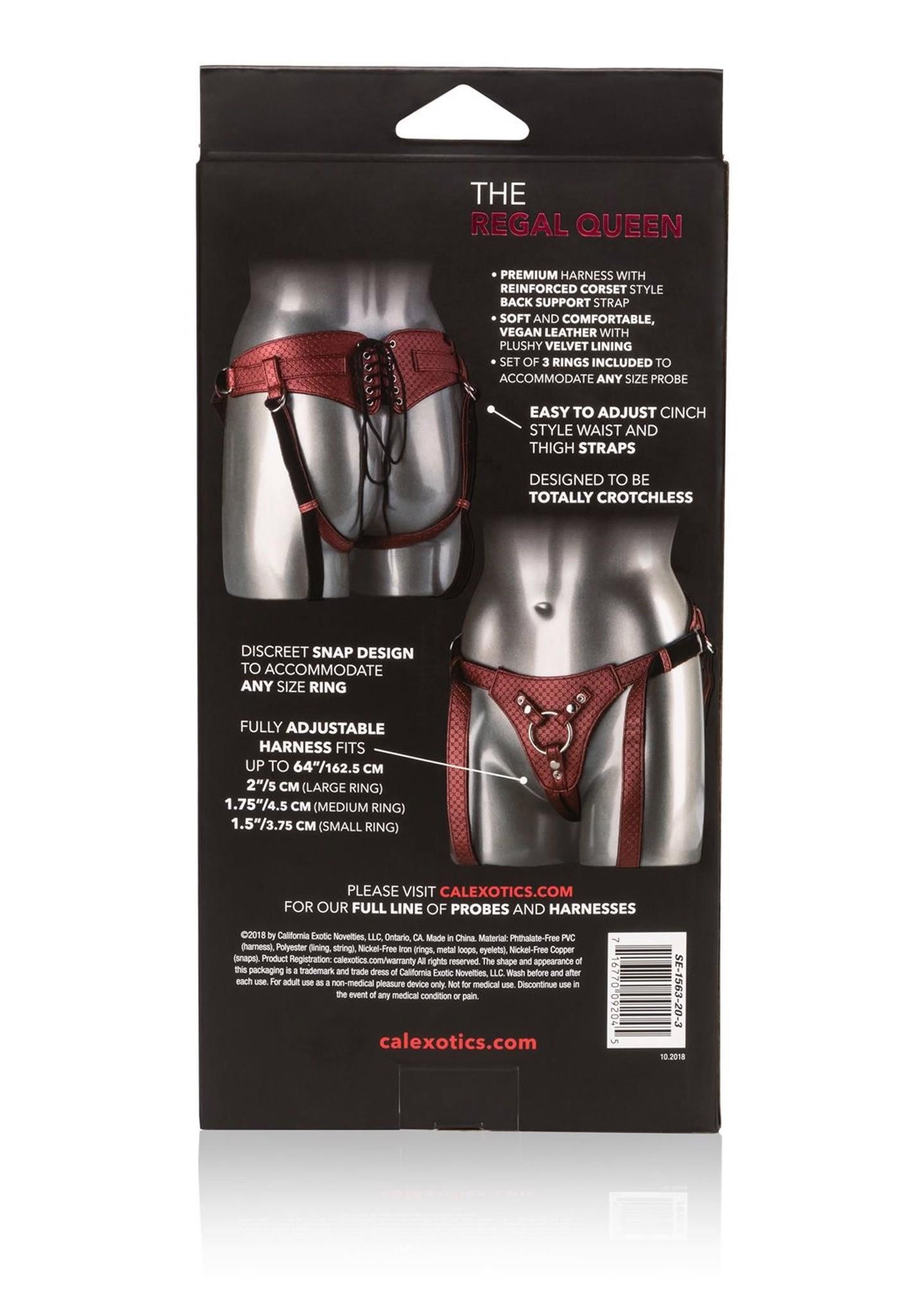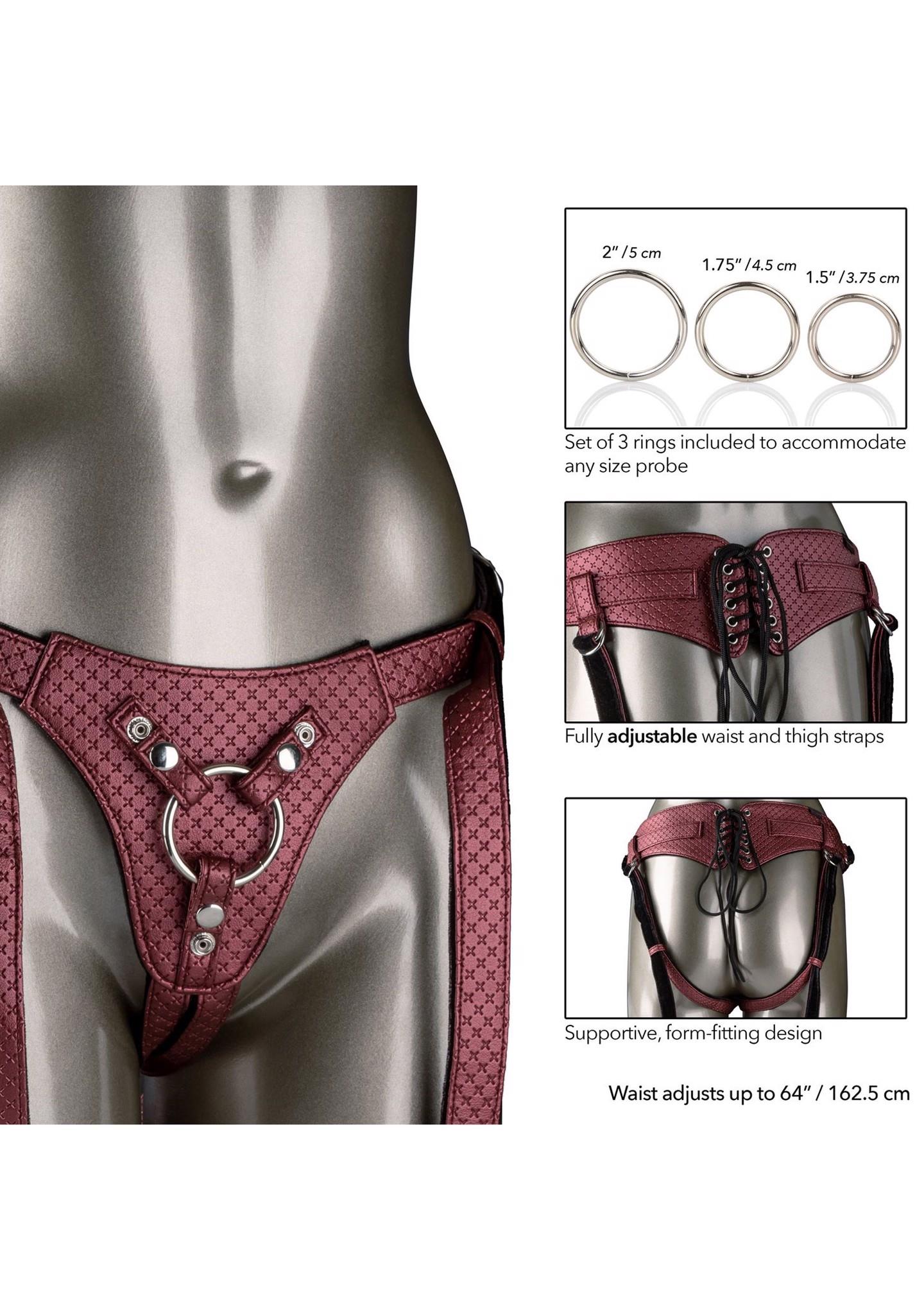 Prepare yourself for indulgent pleasure and premium probe play truly fit for royalty with The Regal Queen. The Her Royal Harness luxurious harness is made for a performance and comfort with a corset-like lace design, plush velvety lining and adjustable buckle enclosure. The bold crotchless design appeals to even the most dominant with the discreet snaps made to accommodate any size probe ring. The designer vegan leather, corset style details and plushy velvet liner give you the ultimate control over comfort.