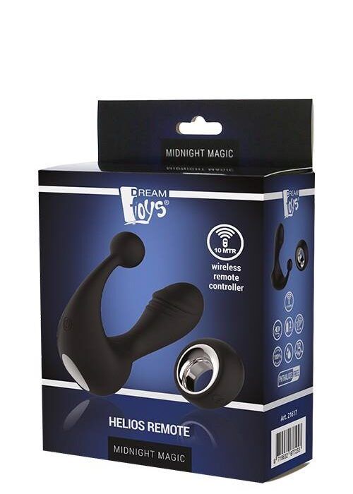 Helios Remote to potężny stymulator ze stylowym bezprzewodowym pilotem zdalnego sterowania. Zarówno stymulator, jak i pilot są wykonane z bezpiecznego dla ciała silikonu, oba można ładować. Silnik znajduje się na elastycznym wałku w kształcie penisa i oferuje 3 poziomy stałych wibracji oraz 9 różnych rytmów. Mocowanie w kształcie kuli zapewnia dodatkową stymulację. Helios mogą być używane przez kobiety i mężczyzn.