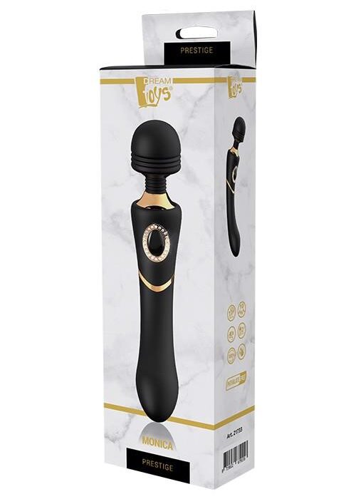 293,00 złStymulator różdżki Monica z kolekcji Prestige od Dream Toys to czarna różdżka ze stylowymi złotymi akcentami, guzikiem w kształcie klejnotu, mocnym, solidnym uchwytem, ??zaokrągloną główką i elastyczną szyjką. Monica ma mocny silnik, który oferuje 7 wzorów wibracji i 3 prędkości. Wibrator Monica Wand można ładować za pomocą dołączonego magnetycznego kabla USB. Wykonany jest z miękkiego silikonu i ABS, wodoodporny i bezpieczny dla ciała, nie zawiera ftalanów ani lateksu. Operację można wykonać jednym dotknięciem przycisku w kształcie klejnotu, który po aktywacji świeci niebieskim światłem LED.