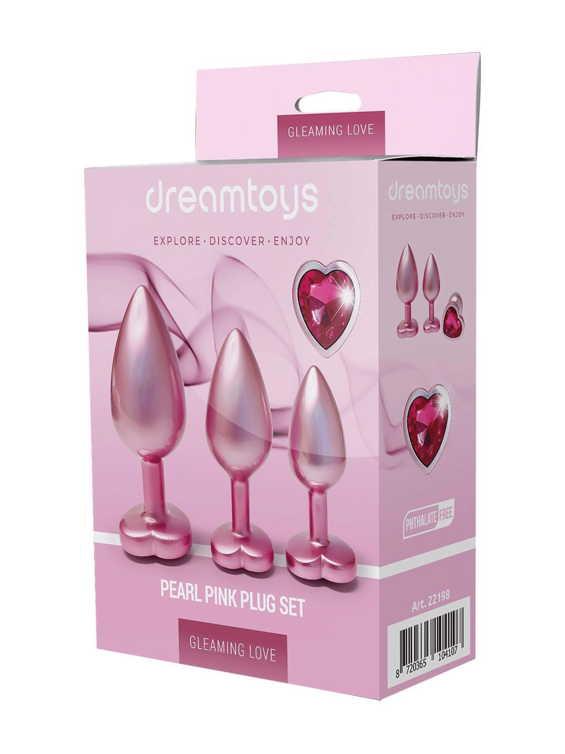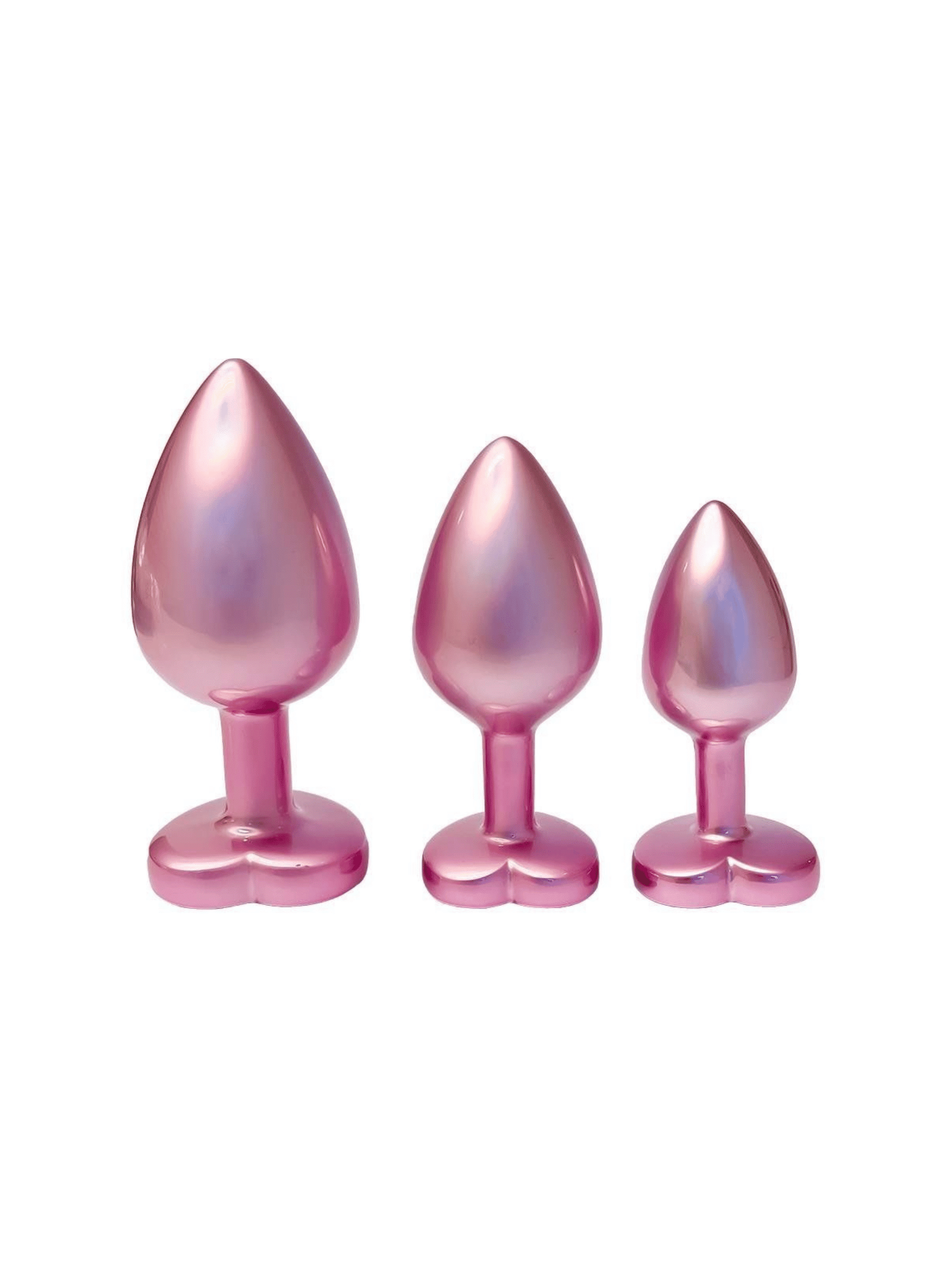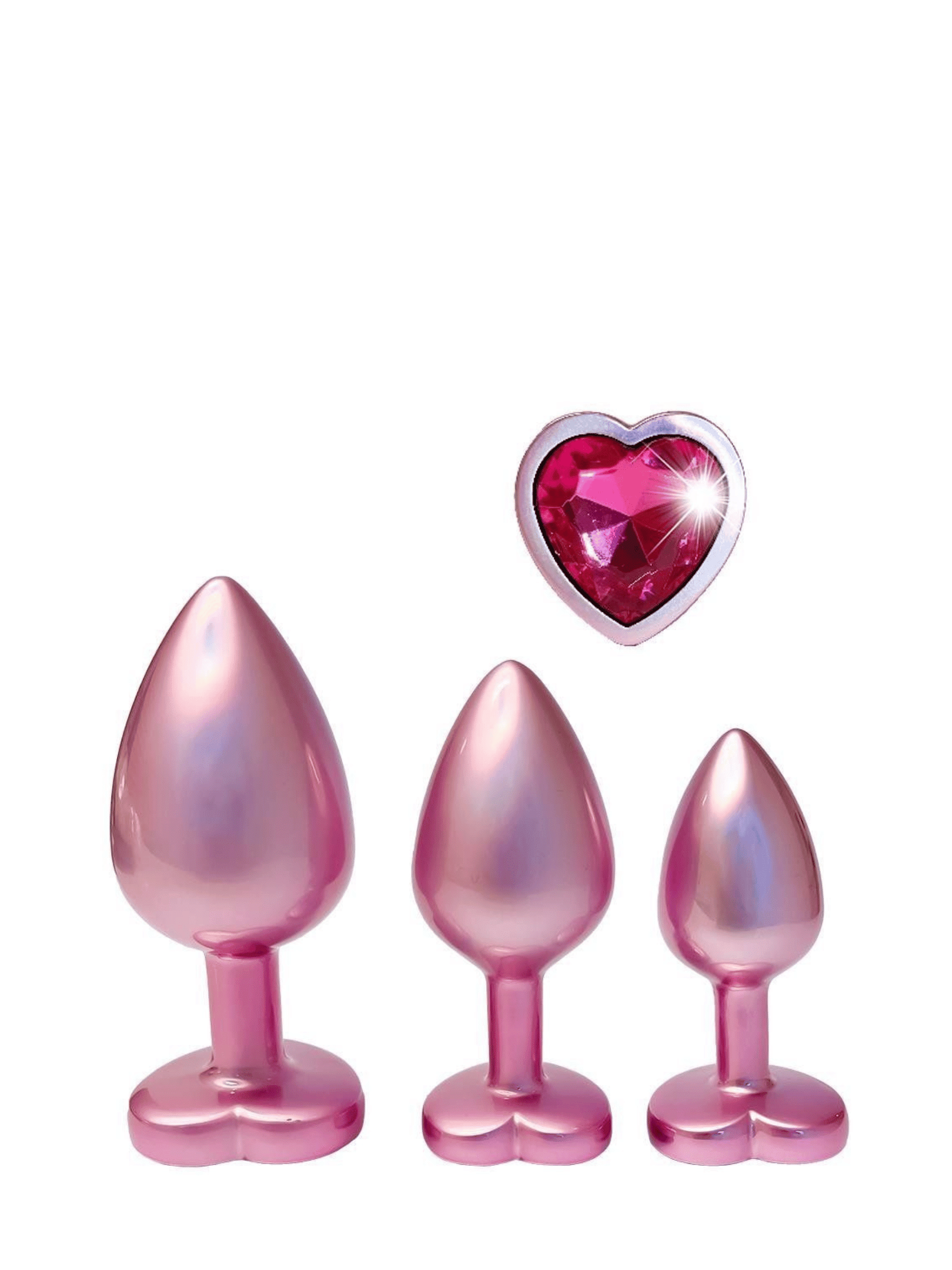 Zestaw korków analnych z kategorii biżuterii analnej, składający się z trzech produktów w różnych rozmiarach. Każdy korek wykonany jest z lekkiego aluminium o gładkiej, bezszwowej powierzchni z perłowym, matowym wykończeniem w kolorze różowym. Korki posiadają zwężaną, stożkową formę oraz rozszerzaną podstawę z dekoracyjnym kamieniem w kształcie serca. W komplecie znajduje się woreczek do przechowywania wykonany z miękkiej, aksamitnej tkaniny ze sznurkiem.