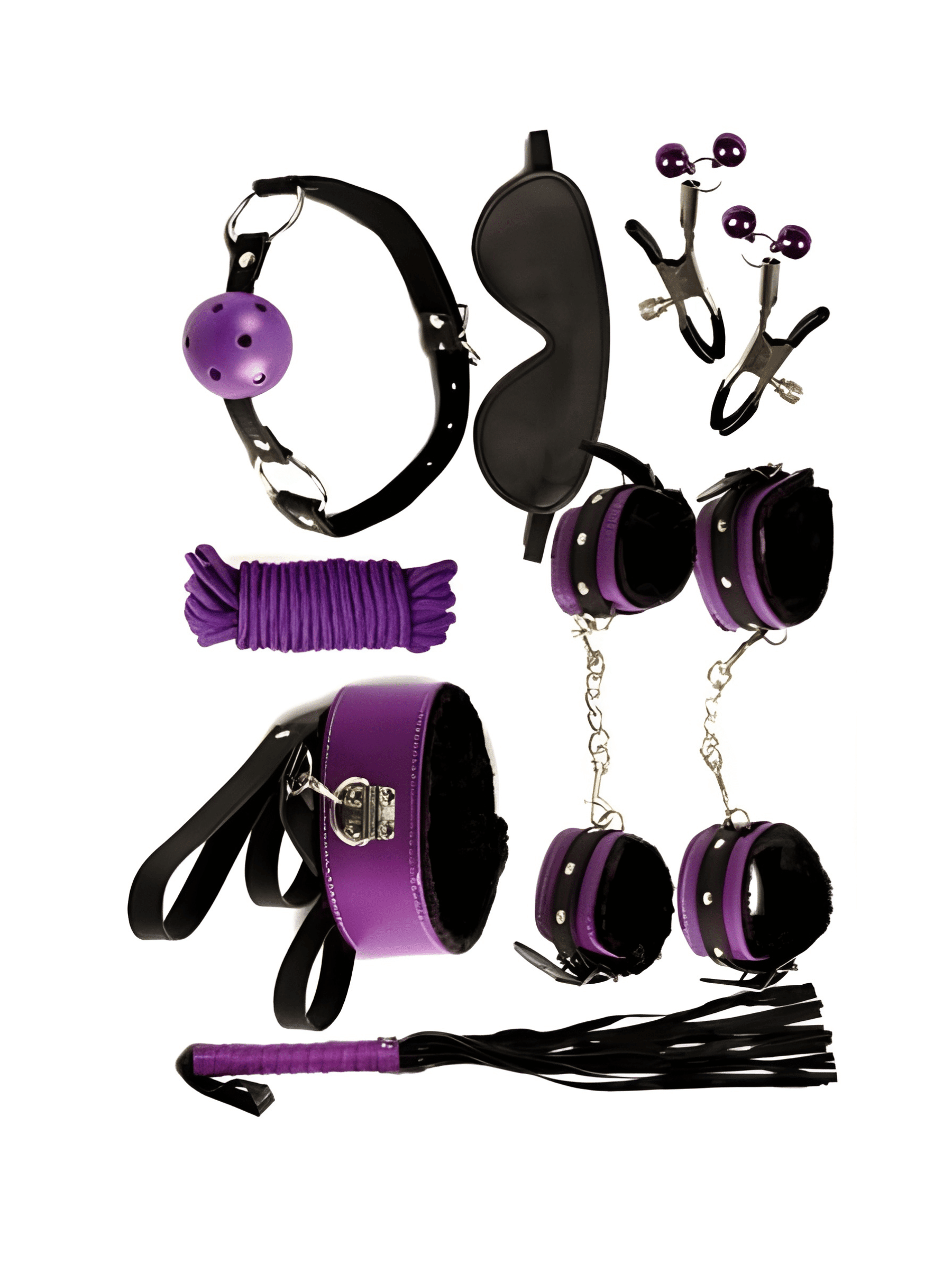 Kompletny zestaw akcesoriów do praktyk BDSM, przeznaczony do różnych form ograniczania ruchów i kontroli. Wszystkie elementy zostały wykonane ze skóry syntetycznej w fioletowym kolorze.
